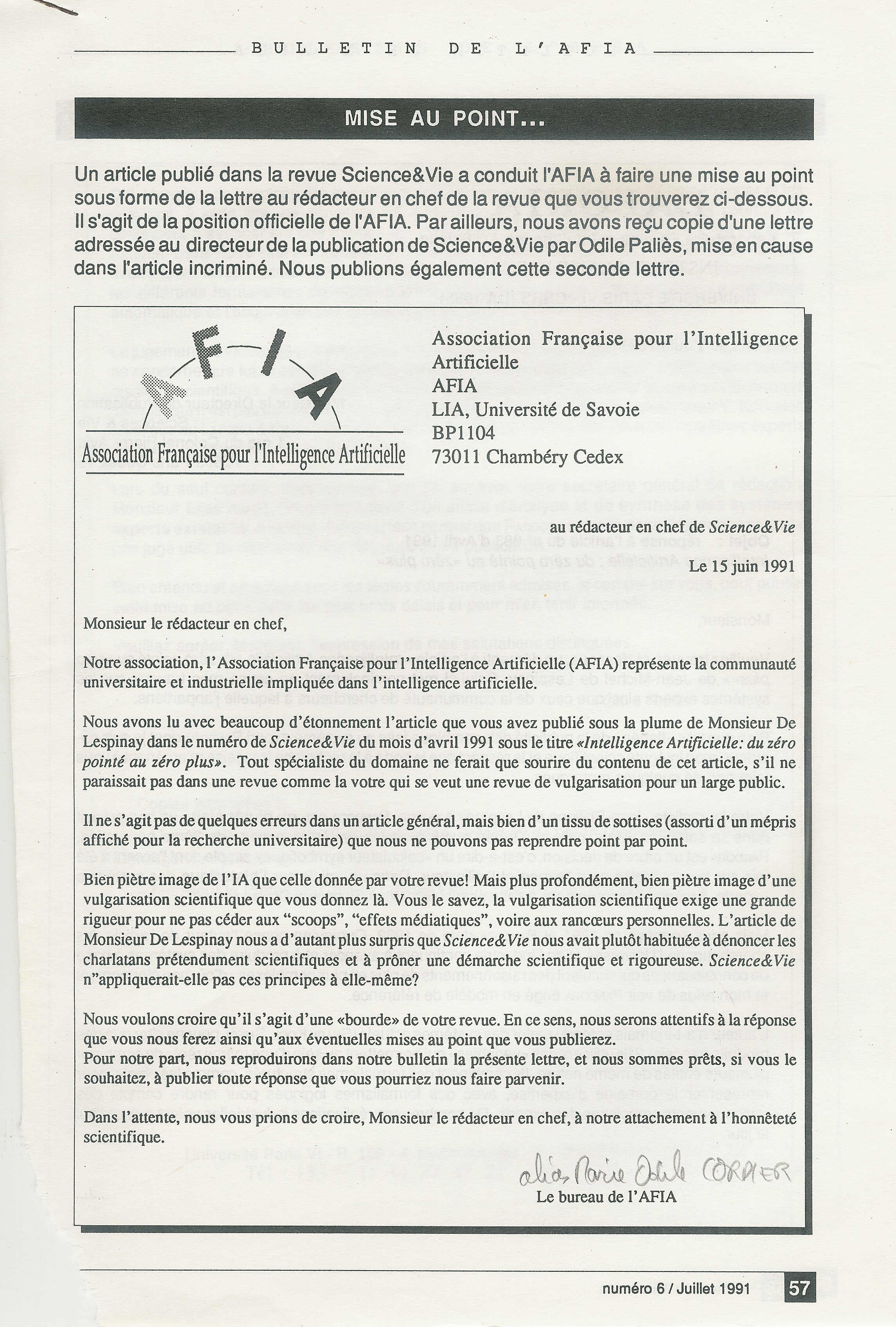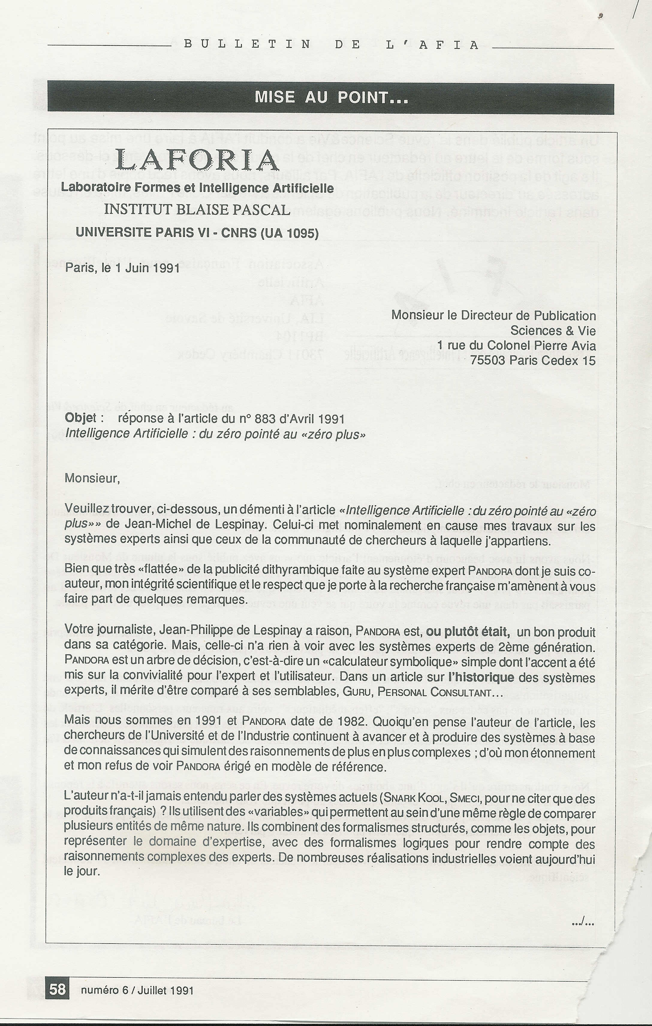 Mon article paraît dans la revue de mai 1991. C’est alors que je reçois en plein plexus ma seconde démonstration de mépris universitaire ! Vous voulez toucher du doigt ce qu’est la suffisance et le mépris, ces deux défauts typiques du médiocre qui hait ce qui lui est supérieur ? L’université française, à travers deux de ses plus prestigieux organismes de recherche en intelligence artificielle, va vous faire vivre cette expérience étonnante ! Elle écrit à Science et Vie au titre du « droit de réponse » ! Et puis quoi encore ? Lisez les lettres qui suivent :