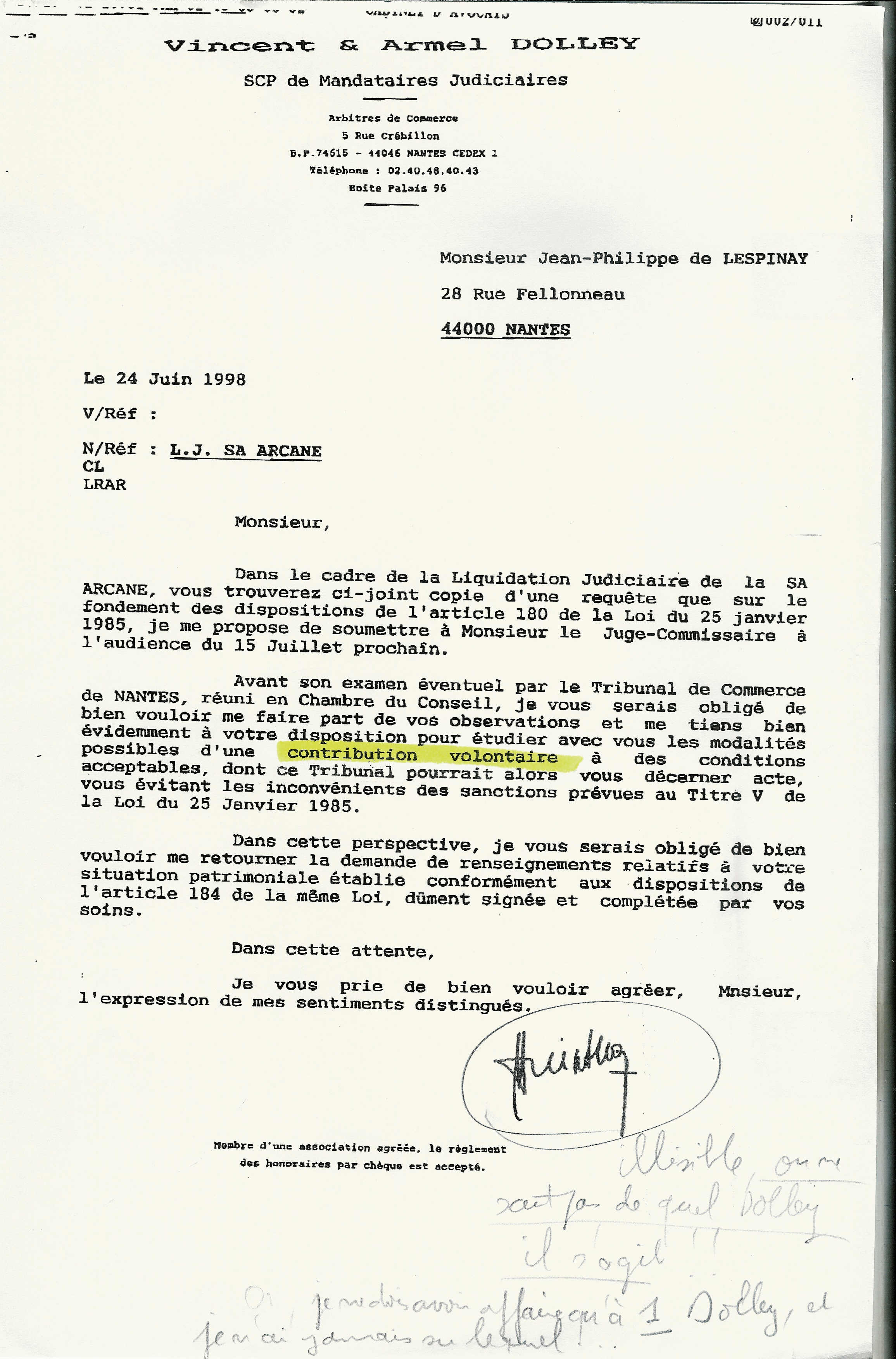 Vous voulez toucher du doigt la corruption ? Lisez bien la lettre ci-dessous, émanant de Maître Dolley, liquidateur de ma société Arcane. Il m’attaque sur mon dépôt de bilan, qu’il juge frauduleux, sur la base des données de l’époque. Or, cet événement a eu lieu il y a trois ans, en 1995. Pendant tout ce temps, avec les mêmes pièces à sa disposition, il n’a rien trouvé à redire et je n’ai eu aucune nouvelle de lui. Pour quiconque, cela signifierait que l’affaire est close. Mais pour moi, c’est sûrement différent… La conspiration de mes ennemis inconnus débouche en 1998 sur une action concertée d’un grand nombre de fonctionnaires du système judiciaire nantais, vous allez le voir. Maître Dolley écrira plus tard (voyez 2004) qu’en fait il a bien fait un faux pour me faire condamner !