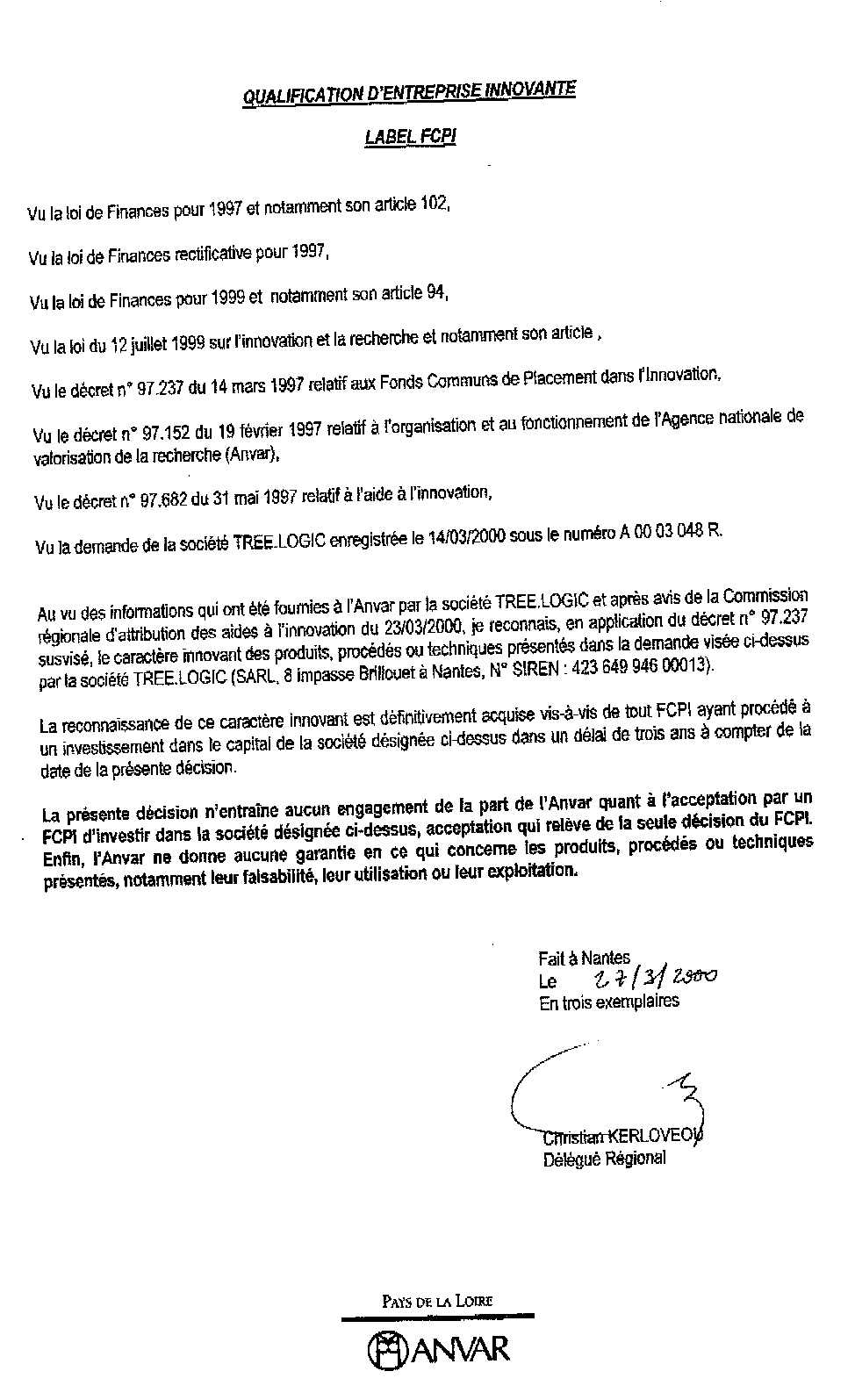La seule reconnaissance scientifique que l’Anvar-Nantes a été obligée de m’accorder depuis l’aide arrachée par « relation » avec l’Élysée en 1990, c’est le label FCPI, le 28 mars 2000, lui aussi à l’arraché… En juillet 1999, grâce à plusieurs investisseurs, j’ai réussi à créer une start-up, Tree Logic, pour développer puis commercialiser le logiciel Tiara, qui rendra l’ordinateur intelligent et vocal grâce à mon invention. Pour mes ennemis cachés, c’est une provocation ! Ils avaient réussi à couler Arcane et à rendre impossible le développement de mon invention et voilà que je récidive, mais cette fois-ci avec le soutien d’un partenaire de poids : une société de capital-risque (ADC) ! Vous l’avez vu plus haut, pas question pour l’Anvar de remplir ses obligations en aidant Tree Logic. Mais, en fait, ce que je ne sais pas encore et que vous allez découvrir plus loin, c’est que la haine de son patron de Nantes, M. Kerlovéou, l’entraîne à de bien pires extrémités : il intrique pour me nuire auprès d’autres administrations et il œuvre pour couler ma société ! C’est dans cette atmosphère de franche camaraderie qu’il est contraint de m’accorder le prestigieux label FCPI… Ce label signale officiellement à l’ensemble des investisseurs et sociétés de capital-risque de France et de Navarre que mes recherches sont valables et prometteuses et qu’il serait intéressant d’investir dedans. Elle accorde aux investisseurs des avantages fiscaux importants s’ils entrent dans mon capital. C’est une incitation à investir dans Tree Logic. Bien entendu, pour Kerlovéou, pas question de m’accorder ce label prestigieux.