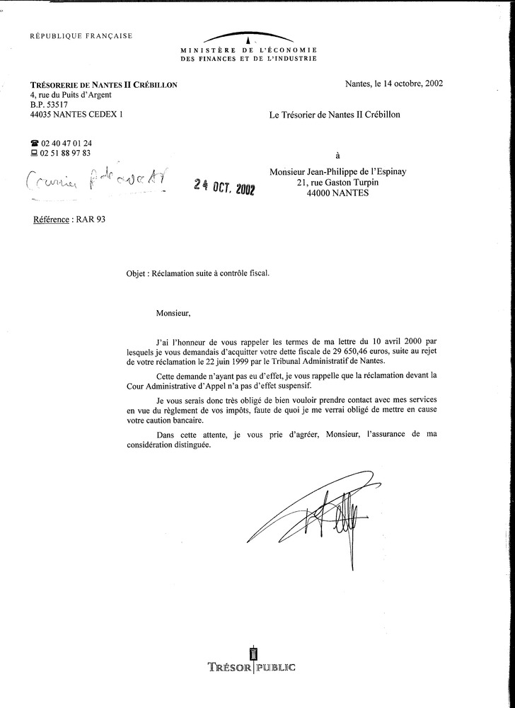 Quand je perds en 1999 contre le fisc grâce à la corruption du tribunal administratif, la somme est devenue exigible. Donc sans attendre le résultat de l’appel (qui n’aura lieu qu’en 2003), contrairement à la loi commune et pour le bonheur des fonctionnaires. Il la récupère donc auprès de ma banque et je me dis que l’affaire est terminée. Naïf, naïf : le 10 avril 2000, le fisc nantais m’adresse un avis de redressement dans lequel il me réclame les intérêts de retard sur ce crédit d’impôt que je n’ai jamais touché et qui, faut-il le rappeler, m’était du ! Auxquels il ajoute 10 % de majoration à titre de pénalité ! Soit un total de 29 650,46 € ! Il vient de doubler la somme ! Je n’en reviens pas d’une telle audace. Il a récupéré le principal, il sait que je suis dramatiquement criblé de dettes, il aurait pu avoir la décence d’attendre !