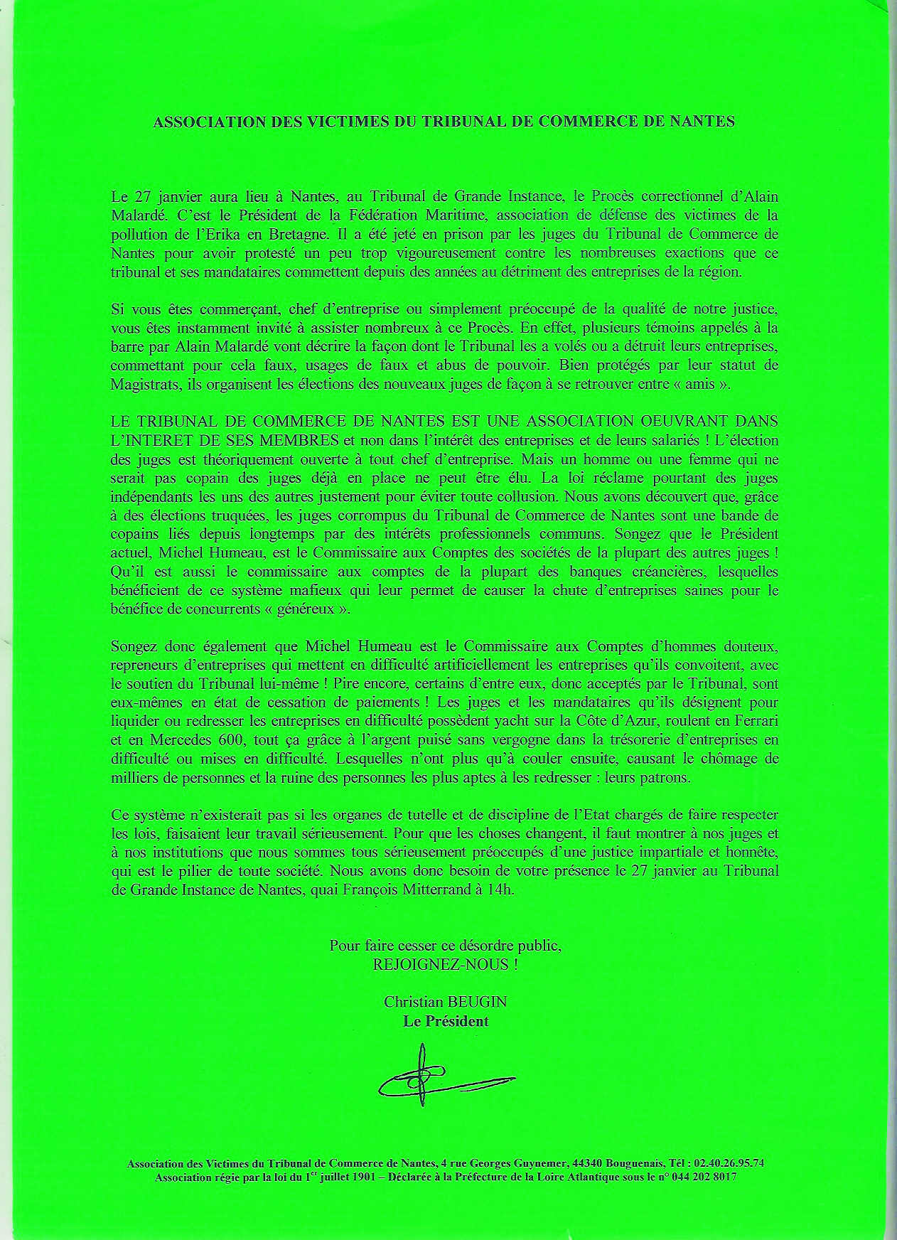 Un jour, je tombe par hasard sur un reportage surréaliste à la télé de M6 Nantes : on y voit dans une salle du tribunal de commerce de Nantes, un homme saisir l’urne contenant les votes servant à élire les juges du tribunal de commerce de Nantes et la jeter par la fenêtre sous les yeux des journalistes ! Il s’agit d’Alain Malardé, qui montre aux journalistes que pour 6 postes de juges à pourvoir, il n’y a que 6 candidats ! Tous seront donc automatiquement « élus »… Malardé poursuit en disant que cette pénurie de candidats est volontaire. C’est une parodie d’élection qui se poursuit depuis des années. Elle permet à des chefs d’entreprise véreux d’être cooptés comme juges et là, de grenouiller dans de nombreuses affaires sordides. C’est cette justice-là qui est censée régler le problème des indemnités de la marée noire de l’Erika que les riverains bretons – dont Malardé – attendent en vain depuis des années. Cet argent circule bien, mais il est capté par des intermédiaires de toutes sortes, dont des politiciens sans scrupule et, à cette allure-là, il ne va plus rien rester pour les gens à indemniser. Je vois un dénommé Christian Beugin prendre ensuite la parole et inviter ceux qui ont des problèmes avec le tribunal de commerce à rejoindre son association, «l’Association des Victimes du Tribunal de Commerce de Nantes » !!! Bon sang ! Il y a une association pour lutter contre les truands du tribunal de commerce ! Pas croyable ! J’y adhère immédiatement et, très rapidement, vu mon activisme habituel, mon expérience associative et mon goût pour la plume, j’en deviens le Secrétaire.