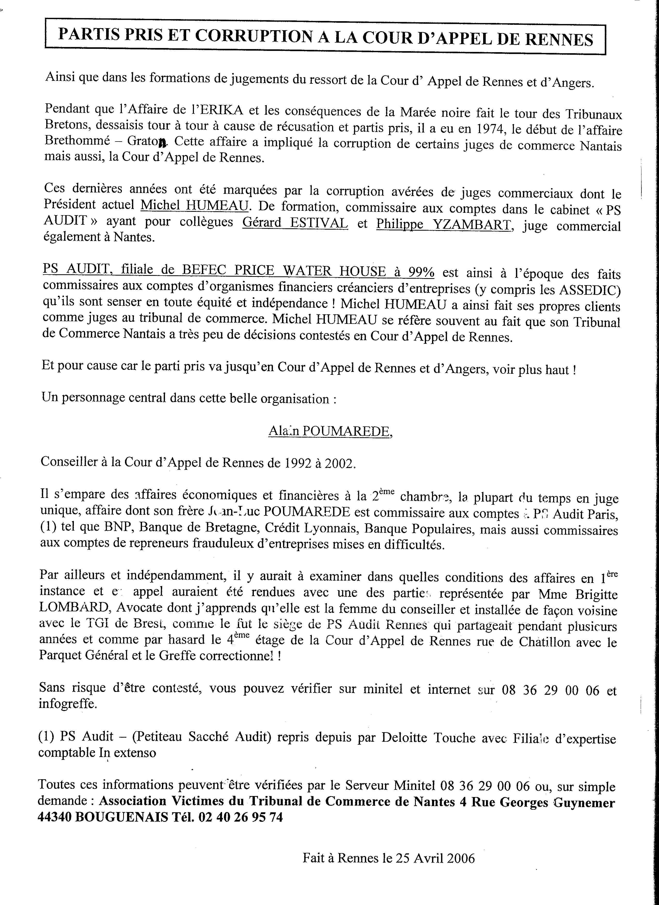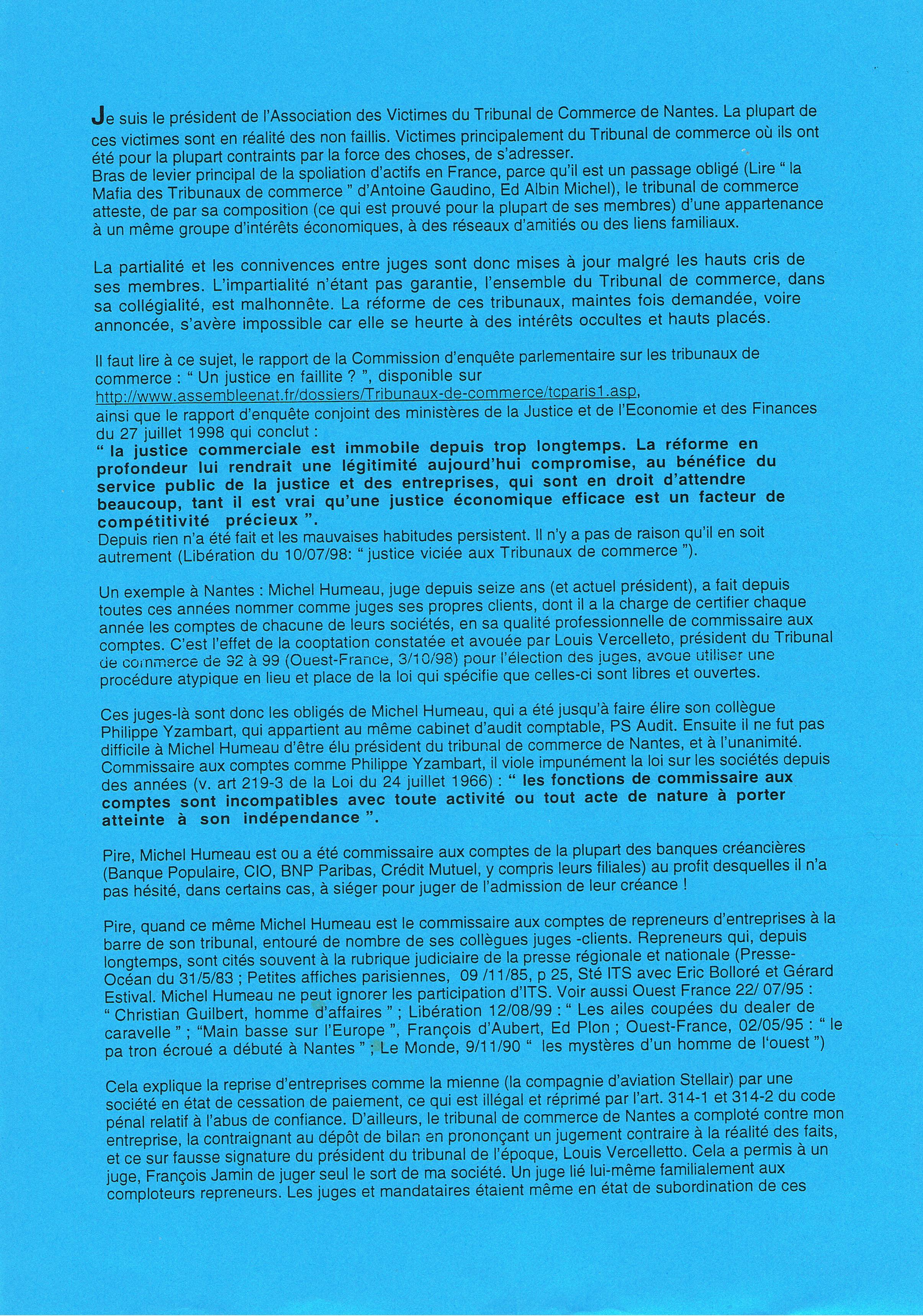 Notez aussi que Le Président du tribunal de commerce Michel Humeau, celui qui a co-décidé mon interdiction de gérer avec Vercelletto, est étroitement lié professionnellement à presque tous les autres juges du tribunal de commerce de Nantes alors que la loi impose que l’indépendance des juges soit garantie ! Il est commissaire aux comptes et expert-comptable, des professions « libérales » étroitement encadrées par l’État et ne disposant quasiment pas de personnel. C’est-à-dire que ce n’est pas un vrai patron qui est devenu président du tribunal de commerce de Nantes. C’est un homme au courant de la comptabilité et des affaires de la majorité des autres juges du tribunal, puisqu’ils sont ses clients. S’il se présentait et qu’on avait le malheur de pas ne voter pour lui, il aurait les moyens d’en faire chanter certains… L’élire, c’est le faire taire mais c’est surtout l’assurance de pouvoir continuer à truander en groupe. C’est ainsi qu’un groupe de gens dépourvus de vraies responsabilités – mais bien pourvus du sens du copinage à but lucratif – ont progressivement occupé tous les postes de juges du tribunal de Nantes.