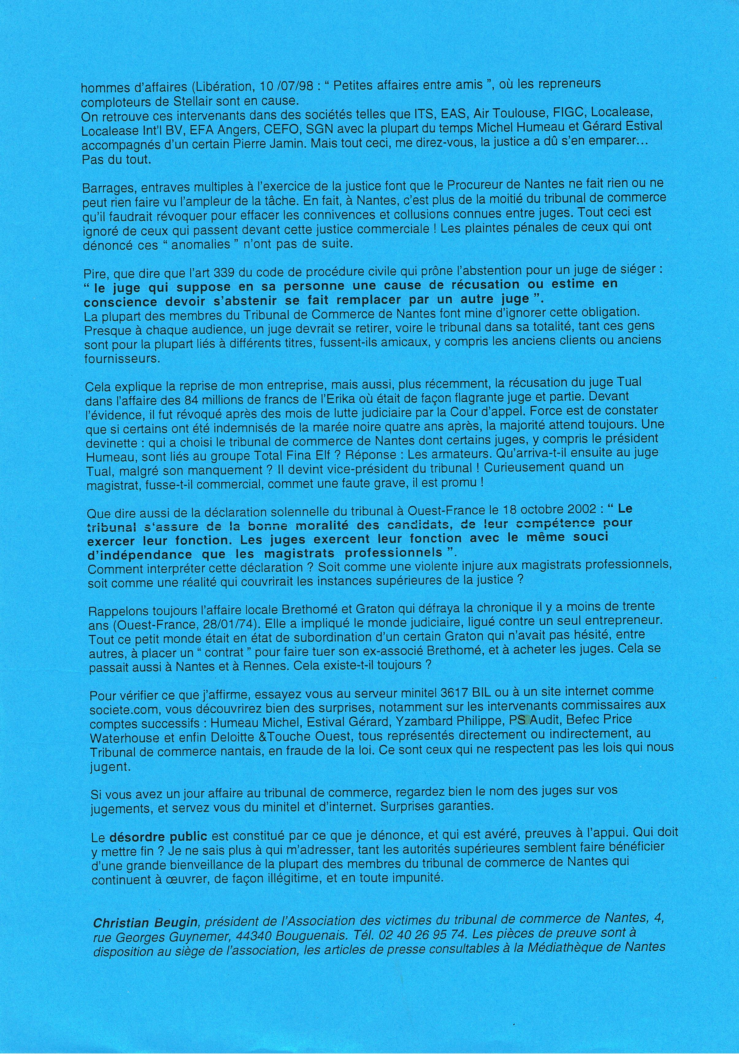 Christian Beugin, très loin d’être manchot (c’est normal pour un patron…) veut absolument comprendre ce qui lui est arrivé et mène son enquête. Voilà ce qu’il découvre : 1) Ses deux banques, Crédit Lyonnais et BNP-Banque de Bretagne, disposent comme par hasard du même commissaire aux comptes : Michel Humeau, juge au Tribunal de Commerce en passe de devenir son Président ! Celui qui m’a conseillé avant mon dépôt de bilan et qui, sans un mot, a laissé Vercelletto m’interdire de gérer pour 10 ans. 2) Les juges du tribunal de commerce de Nantes choisissent comme repreneurs de Stellair des administrateurs et dirigeants de filiales de ces deux banques ! Une démonstration de plus de la collusion maffieuse entre banques et tribunaux de commerce ! 3) iles liquidateurs, aux ordres des juges, cèdent à un prix dérisoire son actif le plus intéressant, ses avions, à une autre compagnie d’aviation : Air Toulouse, laquelle est en cessation de paiement ! On vient donc de transférer par fraude des avions de Stellair à Air Toulouse, quasiment gratuitement, de couler une société saine pour tenter d’en renflouer une autre en difficulté. Au passage, les intermédiaires se rémunèrent grassement. C’est comme ça que fonctionnent nombre de « tribunaux » de commerce, sous le regard complaisant et le silence des procureurs de l’État, des justices d’appel et de cassation qui, tous, doivent bien se faire graisser la patte quelque part. Il paraît que le silence, ça s’achète… Toujours pas manchot et ulcéré de l’escroquerie dont il a été victime, Christian Beugin harcèle les médias et inonde Nantes de tracts portant son adresse et sa signature démontrant la corruption des juges nantais et rennais. On en parlera un peu dans les journaux de Nantes mais ces articles croustillants ne déclenchent aucune réaction des pouvoirs publics ! Aucun procureur ni aucun représentant de l’État ne viendront à son secours en enquêtant auprès de lui. Il est ruiné, on l’a expulsé de son domicile par la force publique, il n’a pas de voiture, il circule en scooter, sa femme l’a quitté… ça me rappelle mon histoire, vous ne trouvez pas ?