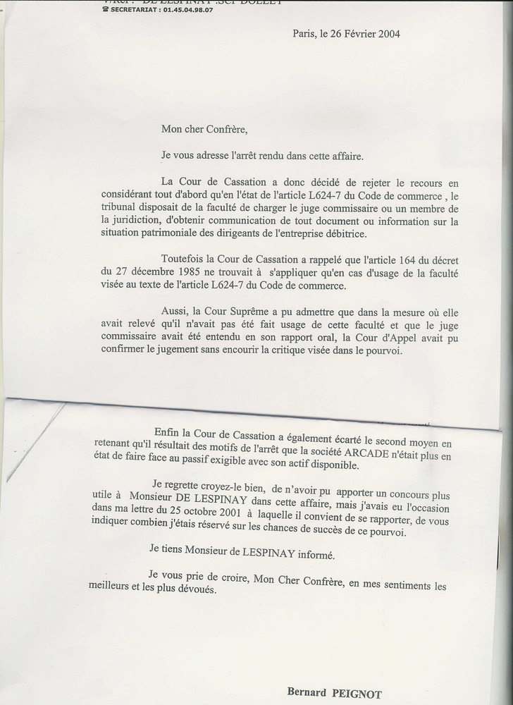 Ma condamnation à l’interdiction de gérer étant confirmée en appel à Rennes, il me reste la cassation. Cette fois-ci, il faut prendre un avocat auprès de la Cour de Cassation et ça coûte très cher. Mais recouvrer mon honneur n’a pas de prix et j’en prends un, au hasard : Maître Peignot. Je lui joins les pièces pour statuer sur la possibilité d’un recours, dont des tracts de l’Association des Victimes du Tribunal de Commerce de Nantes qui impliquent nommément plusieurs juges du Tribunal de Commerce dans des actions douteuses et les courriers que Vercelletto m’a adressé. Ses écrits à mon sujet démontrent son animosité personnelle envers moi. Au départ Me Peignot a des réticences : selon lui, ça ne va pas être facile de trouver des points de cassation… Je m’étonne que la justice puisse rendre définitivement vrai un dossier manifestement faux sans que cela regarde la cour de cassation. Il finit par accepter, ayant trouvé 3 points de cassation. Mais aucun de ces points à mes yeux ne relate l’essentiel : j’ai tout de même échangé des courriers diffamant avec un juge devenu un ennemi personnel, lequel pour se venger m’avait fait convoquer au tribunal dont il était Président, se faisant nommer président de séance, puis m’avait jugé et condamné ! Vercelletto aurait du se désister comme la loi l’y oblige pour ne pas être « juge et partie ». Son but évident était de me condamner.