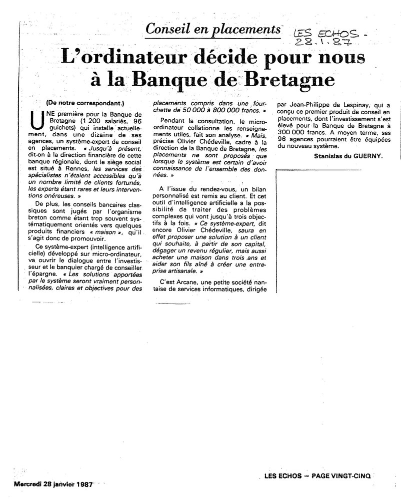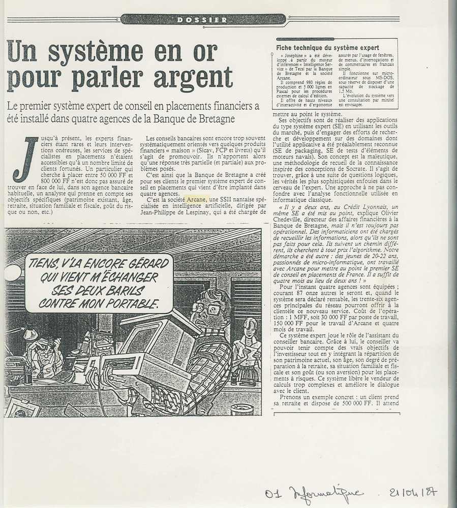 C’est le premier système expert de l’histoire dialoguant directement avec les gens de la rue entrant dans la banque, et non avec des experts spécialement formés à l’utilisation du logiciel. C’est donc une belle réussite. J’ai fait la preuve irréfutable que l’IA a bien un avenir.
