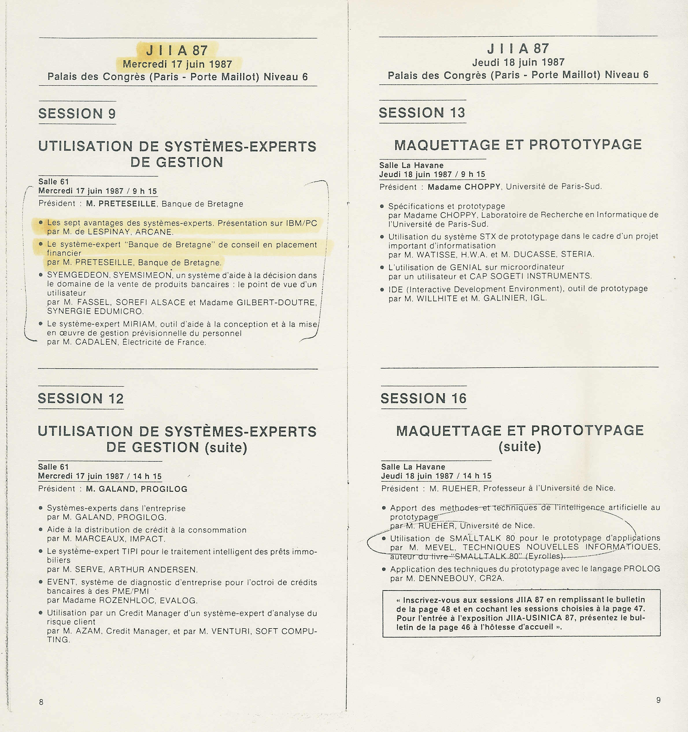 En 1987, je loue un stand pour présenter mon invention et Joséphine aux « JIIA », Journées Internationales de l’Intelligence Artificielle. C’est un grand colloque mondial, organisé cette année par la France, àAvignon dans le Palais des Papes. Quand j’arrive dans la salle d’exposition, je découvre sur mon stand, comme tous les autres exposants, un formulaire nous invitant à proposer une conférence si nous avons à notre actif une réalisation en IA. Il paraît qu’en dépit des appels à conférences internationaux il y a trop d’exposés théoriques ce qui désole les organisateurs du Colloque. Ils ont besoin d’exemples concrets en IA. Je saute sur l’occasion et propose une conférence sur la Maïeutique, avec même démonstration de Joséphine, le « fameux système expert dont on parle tant dans la presse », sur grand écran par vidéoprojecteur ! Je propose de faire la présentation en compagnie d’un expert de la Banque de Bretagne, M. Prèteseille, qui m’a communiqué son accord. Il faut savoir qu’à l’époque – et encore aujourd’hui ! – personne n’ose faire de démonstration de logiciel innovant devant le grand public, de peur de « l’effet démo » (le plantage humiliant du logiciel devant tout le monde…). Je serai sûrement le seul à proposer une présentation aussi révolutionnaire, qui va redonner à l’IA le lustre que tous les chercheurs espèrent pour décrocher des subventions de recherche. Je me dis qu’enfin, je vais avoir la reconnaissance internationale qui va permettre à ma société de décoller !