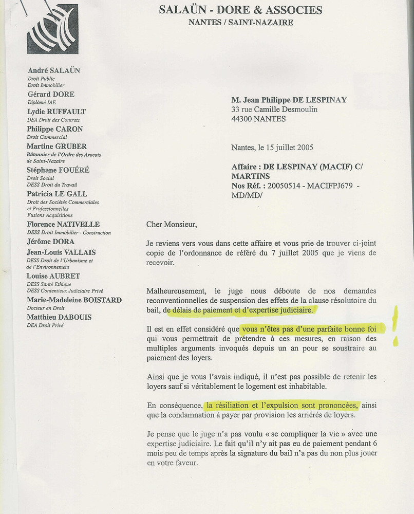 Armé de mes 5 expertises, avec photos, du témoignage du précédent locataire et de mon attestation de recevabilité au surendettement, je me présente devant le juge de référé avec l’avocat payé par la Macif, Me Dabouis. Comme d’habitude, ça se passe bien en audience et je rentre chez moi, attendant le verdict. C’est mon avocat qui me communique la douloureuse :