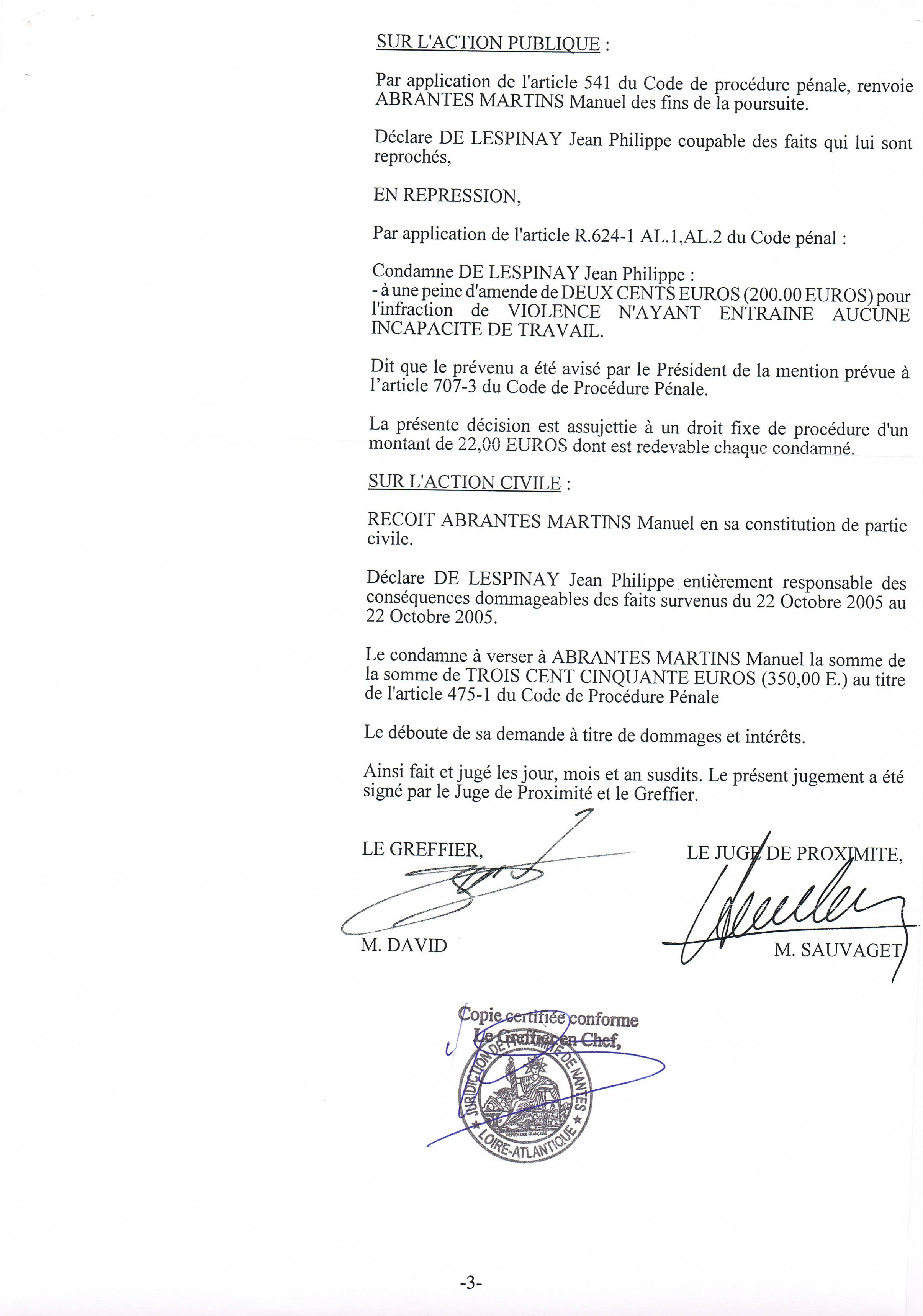 L’après-midi, je reviens au greffe et demande le résultat des courses. J’y rencontre l’avocat de Martins, Me Delalande, que je connais. Nous apprenons ensemble que …je suis condamné. Mais, quelle surprise ! En ces simples termes : « Il résulte de l’enquête préliminaire et des débats que les faits sont établis et sont bien imputables à de Lespinay Jean-Philippe. Il convient donc de l’en déclarer coupable et de lui faire application de la loi pénale ». C’est ainsi que je suis condamné à payer à Martins 200 € plus 350 € au titre de l’article 700 ! Ce salaud a gagné une fois de plus ! Me Delalande, lui, n’a pas l’air étonné… Je sollicite un peu de compassion en lui expliquant que je passe ma vie à me faire escroquer par les juges. Je lui raconte rapidement quelques unes de mes condamnations frauduleuses et ma plainte pour forfaiture contre Castagné. Neutre, il me regarde sans mot dire. Bizarre. Il doit être au courant de ma mise à l’index… En tout cas, il ne me donne pas un signe de réconfort. Je déclare au greffier que je fais appel. Mais cette fois-ci, me dis-je, il faudra que je prenne un avocat…