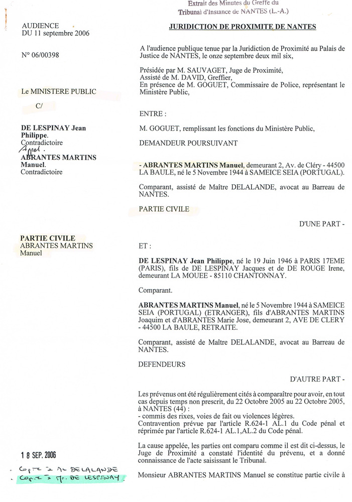 Suite à ma plainte contre Martins, je reçois le 22 juin une assignation à comparaître au tribunal le 11 septembre 2006. Je note tout de suite une incongruité : je suis convoqué « prévenu d’avoir (…) à l’encontre de Abrantes Martins Manuel (victime) commis l’infraction relevée à Nantes au procès verbal n° 17452 » ! En somme, c’est moi qui porte plainte et je suis présenté comme l’agresseur ! Je contacte tout de suite mon avocat, le jeune Matthieu Dabouis, celui qui a tant de respect pour Castagné. Il n’y trouve rien à redire ! Il trouve cette formulation normale. Décidément, la logique humaine n’est pas celle de nos avocats, qui semblent perpétuellement satisfaits du fonctionnement de la justice ! Pourtant, voyez ci-dessous, le débat est bien prévu pour le compte de : « demandeur poursuivant : Abrantes Manuel Martins PARTIE CIVILE » ! Il y a sûrement là un coup fourré que mon avocat ne voit pas mais qui fait réagir mes antennes de mec roué de coups tordus depuis une décade.