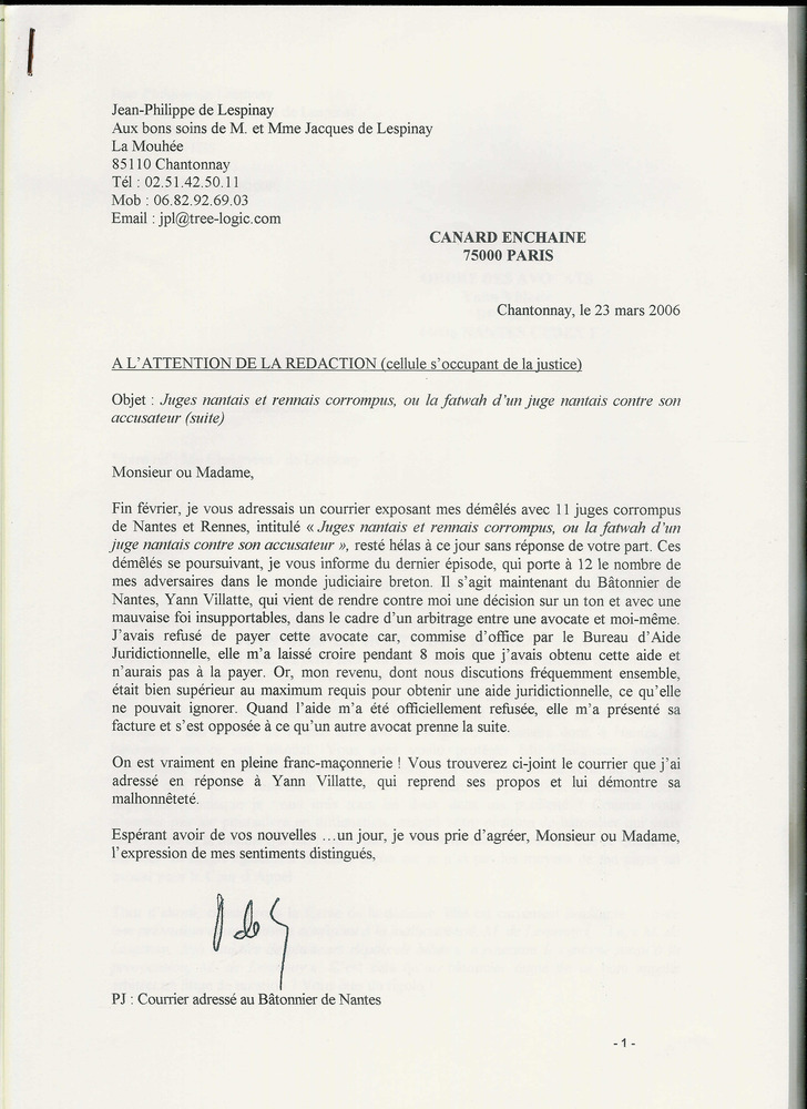 Le 25 janvier 2006, j’adresse à l’ensemble des médias un mailing dénonçant la corruption des juges de Nantes et Rennes. Pas un ne répond ! Même pas ces journaux contestataires ou satiriques comme le Canard Enchaîné, Libération ou Minute ! Le 15 septembre 2006, j’adresse un deuxième mailing, incorporant les derniers évènements. J’écris également au député Arnaud Montebourg, bien connu aujourd’hui. Il avait lancé sa carrière en dénonçant la corruption des tribunaux de commerce… C’est LA personne qui peut comprendre immédiatement mon problème. Mais ce pseudo « Monsieur Propre » est un « Monsieur Sale »… Il ne se donne même pas la peine de me répondre. Il fait partie de ces élus peu honnêtes qui démarrent leur carrière sur un thème « porteur », pour se faire connaître – ici un sujet de corruption croustillant – puis qui l’abandonnent leur réputation une fois faite, laissant sur le carreau tous ceux qui comptaient sur lui…