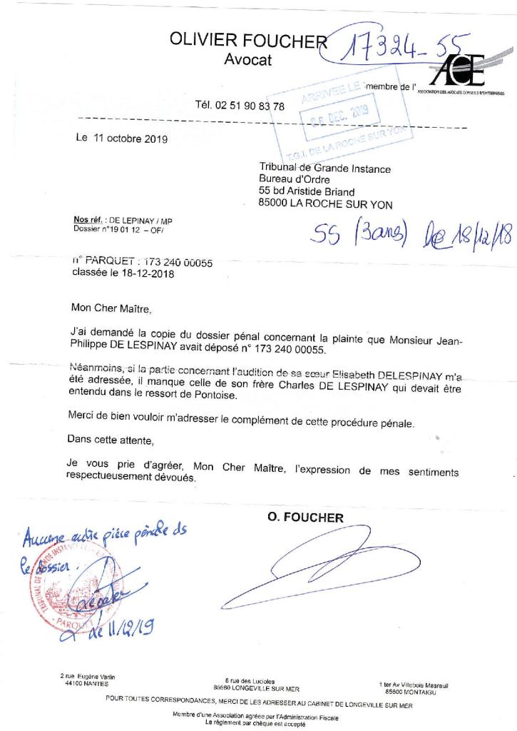 Cet escamotage de pièces est-elle l’oeuvre de Claude Oesinger désireux de protéger ses deux complices mon frère et ma soeur qui avaient profité de sa mise sous tutelle pour mettre le château de famille à sac, furent pris la main dans le même sac par des commissaires priseurs en visite chez eux, mais furent ensuite protégés par les juges de Pontoise ? Ou est-ce l’oeuvre du procureur de la Roche sur Yon désireux de protéger Claude Oesinger ?