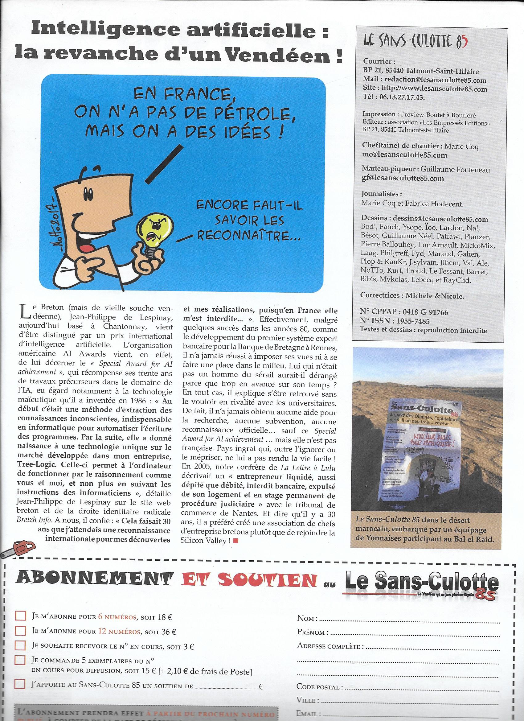 En février 2017, j’ai eu la chance de recevoir un prix d’intelligence artificielle, attribué par awards.ai, un groupe de médias américains : « Winner of the Special Award for AI Achievement is : Jean-Philippe de Lespinay of Tree Logic (http://www.tree-logic.com). AI signifiant IA en français (= intelligence artificielle).