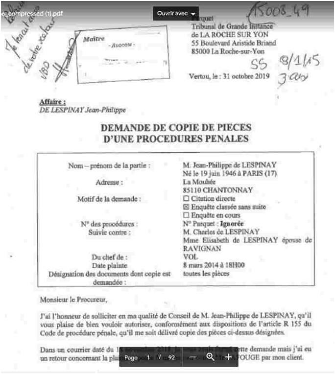 - 2019 – Pour connaître les résultats de l’enquête suite à mes plaintes pour vols (8 mars 2014) mon avocat réclame au procureur copie de sa procédure : un an après, elle arrive sans les auditions des voleurs, soigneusement retirées !