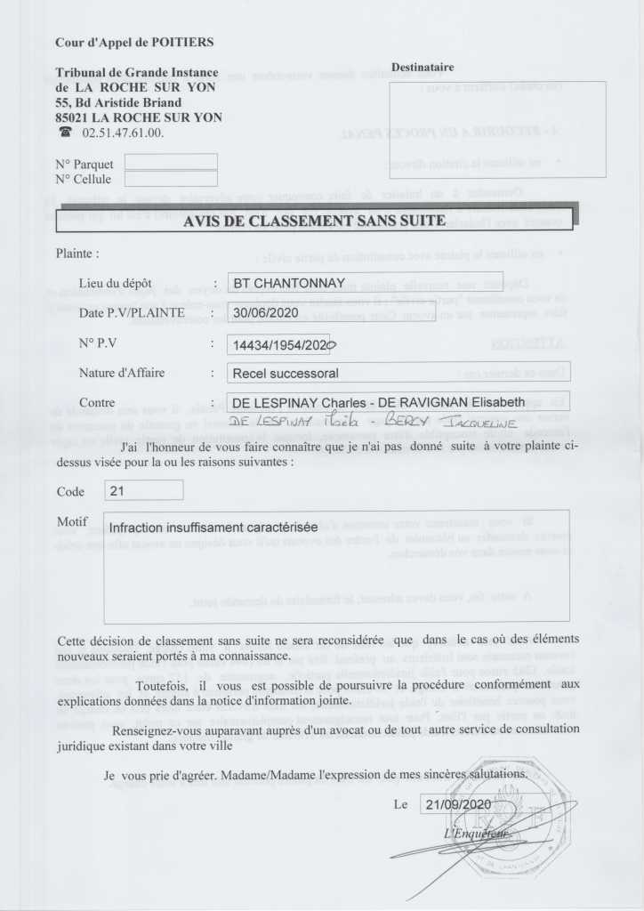 Les tribunaux ripoux de Pontoise et Versailles vont s’appuyer sur ce classement sans suite pour affirmer – en dépit des prisées que je leur présente ! – qu’il n’y a pas recel successoral chez mon frère et ma sœur et qu’en conséquence il faut me condamner à les dédommager pour procédure « abusive » et « dilatoire ». Et, en plus, ils gardent les biens volés !