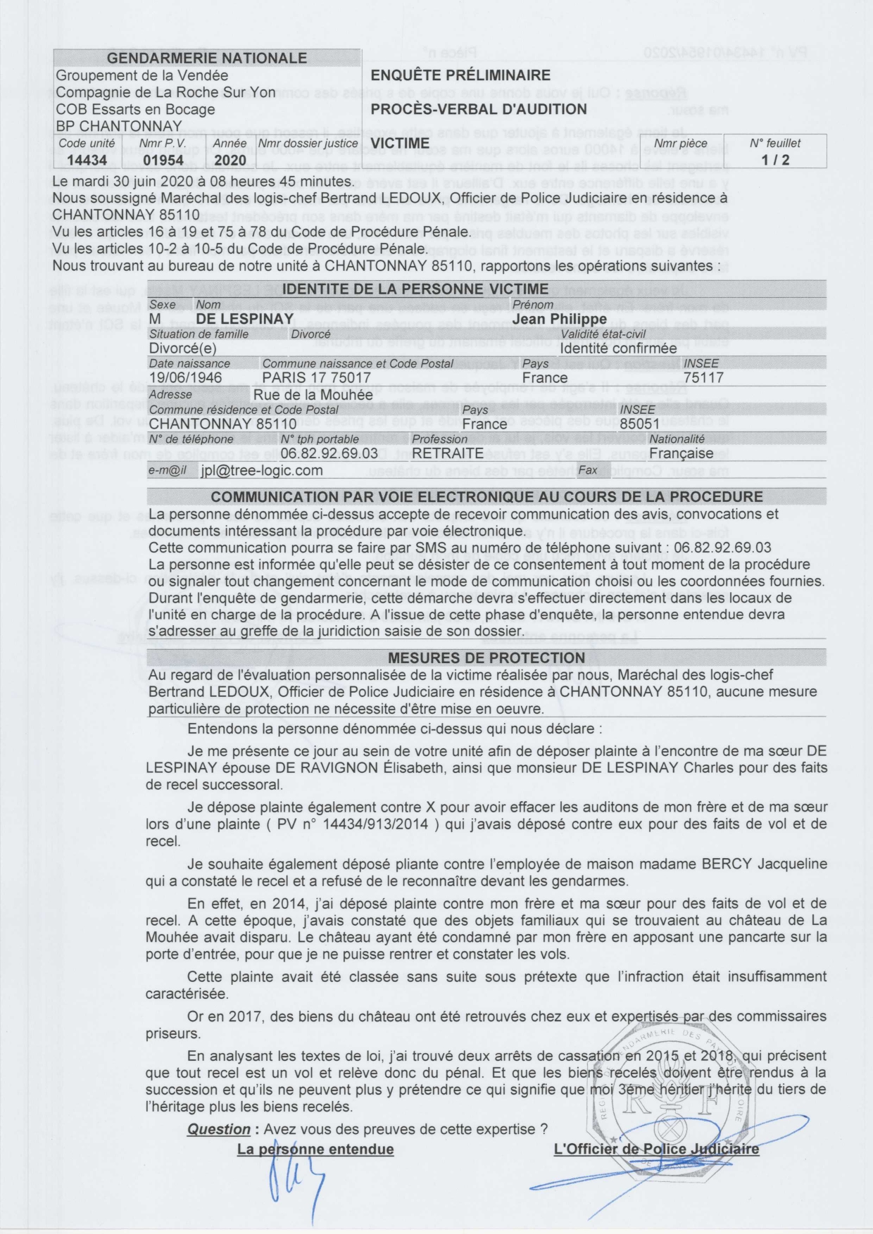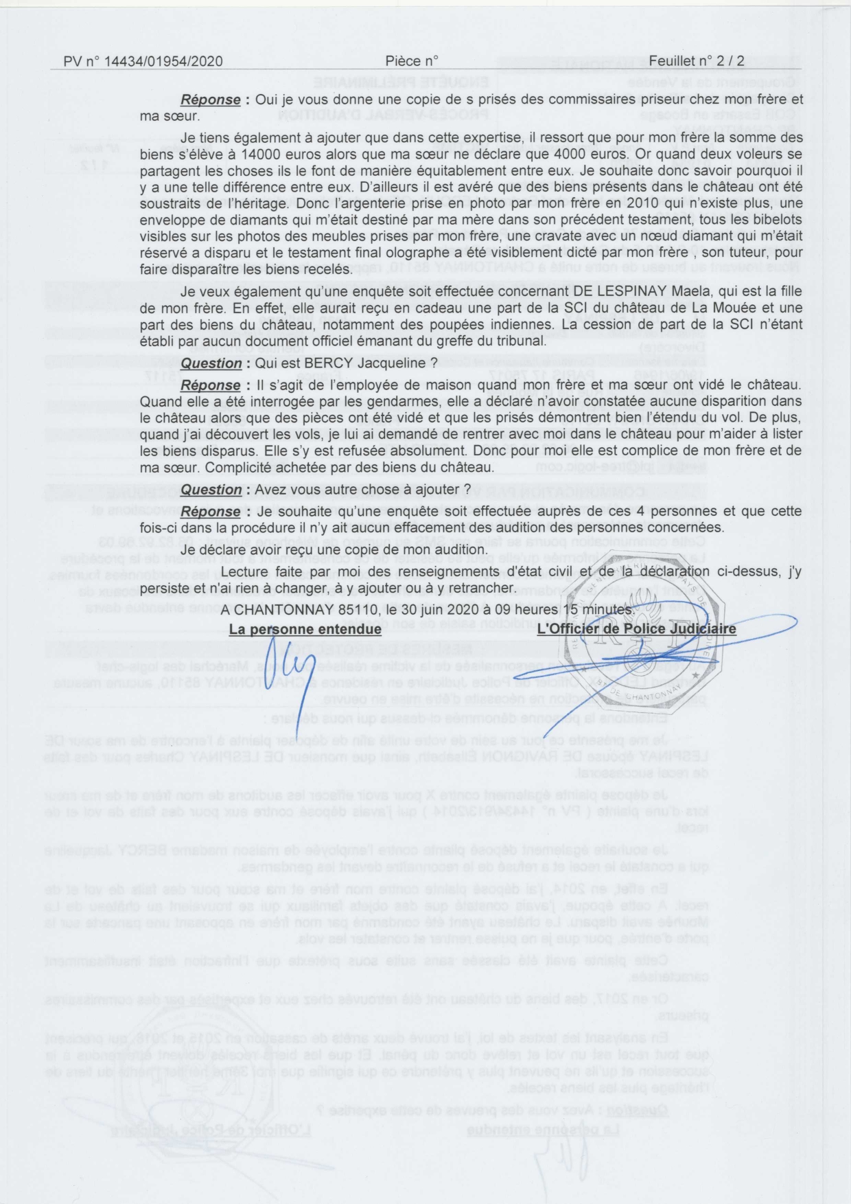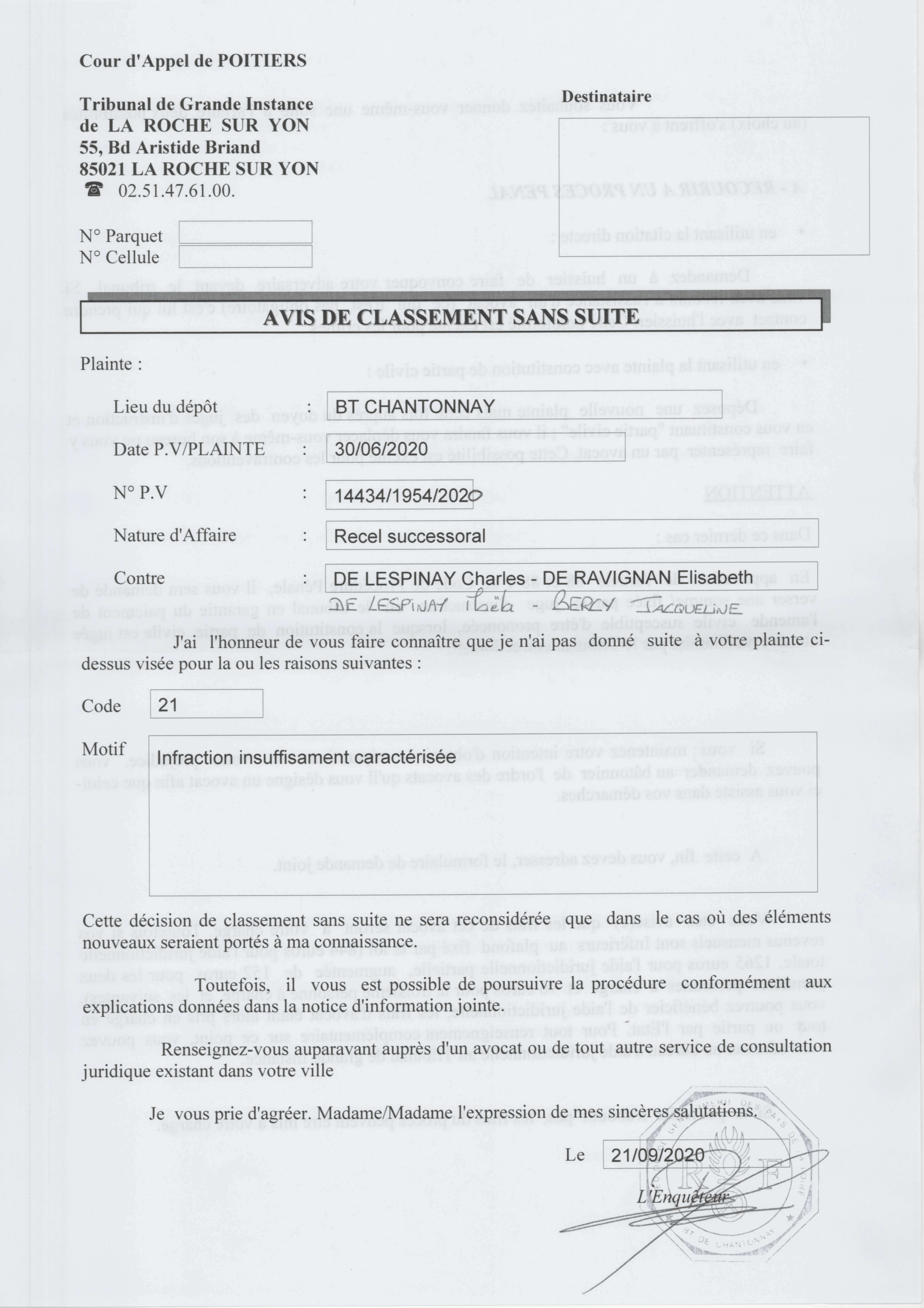 Voyez ci-dessous, ma plainte pour vols déposée en 2014 est claire et supervisée fin 2019 par le procureur Emmanuelle Gatta-Lepissier du tribunal de la Roche sur Yon : elle vise bien mon frère et ma sœur pour leurs vols dans la demeure de famille.