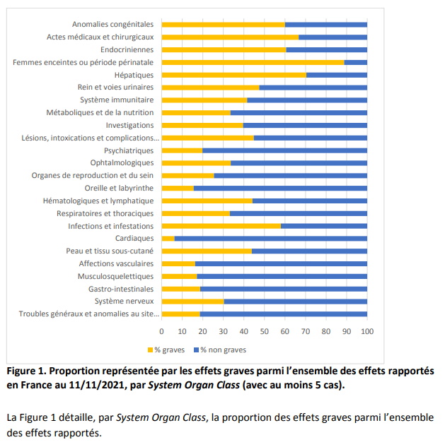 - Le tableau ci-dessous provient de l’Agence nationale française du sécurité du médicament, l’ANSM (qu’on ne peut accuser de surévaluer les dangers de la vaccination en tant qu’administration aux ordres de Macron) : 132 892 effets indésirables dus aux vaccins en France sur la seule année 2021, sachant qu’il n’y a pratiquement pas eu de vaccination jusqu’en avril 2021. A comparer aux 123 000 décès attribués au Covid depuis deux ans. Le quart est jugé grave par l’ANSM, soit 28 000 cas graves ! Cette proportion de cas graves bondit à 28 % sur les seuls 13 premiers jours de janvier 2022 (et même à 30 % pour BioNTech et Pfizer) ! Devinez pourquoi… Vous pouvez vous-même consulter ces données ici : https://ansm.sante.fr/uploads/2022/01/21/20211220-vaccins-covid-19-fiche-de-synthese-ansm-vf.pdf en n’oubliant pas qu’il s’agit de chiffres officiels. Comme on l’a vu au chapitre 1 sur la corruption pharmaceutique, il est très facile de biaiser une enquête. Nous avons peut-être sous les yeux l’arbre qui cache la forêt. L’avenir nous le dira.