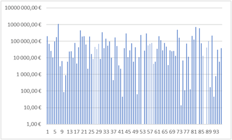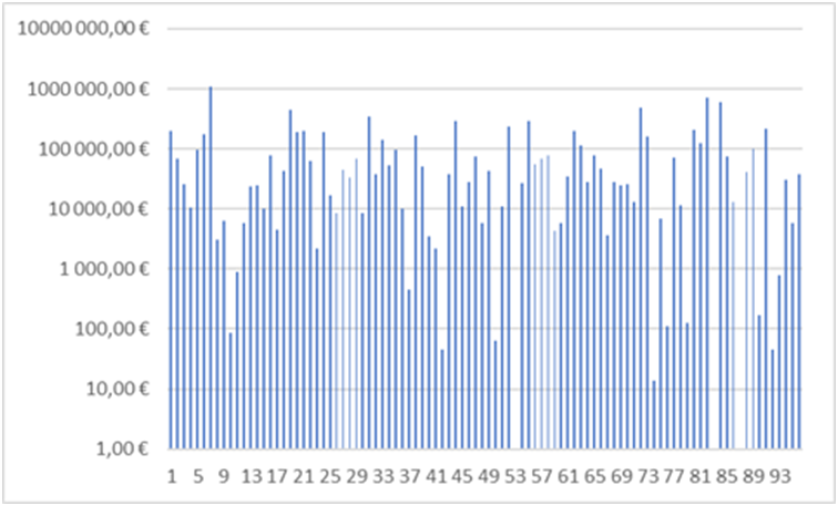 - Ci-dessous un histogramme que s’est procuré Arthur Leroux début juillet 2021 on ne sait comment, qui montre la hauteur de sommes autrement plus importantes : 8,8 millions d’Euros versés aux 96 médecins qui ont publié une tribune dans le Journal du Dimanche pour lancer un « appel à la vaccination obligatoire des soignants ». Soit en moyenne 91 667 € par signataire ! J’aimerais en être… Ignorant la source, je ne peux démontrer que cette stupéfiante information est vraie, mais elle a été reprise publiquement par des politiques (Florian Philippot en tête) qui l’ont hurlé sur les toits publiant les noms de chaque bénéficiaire sans que personne, et surtout aucun des 96 accusés, ne démente !