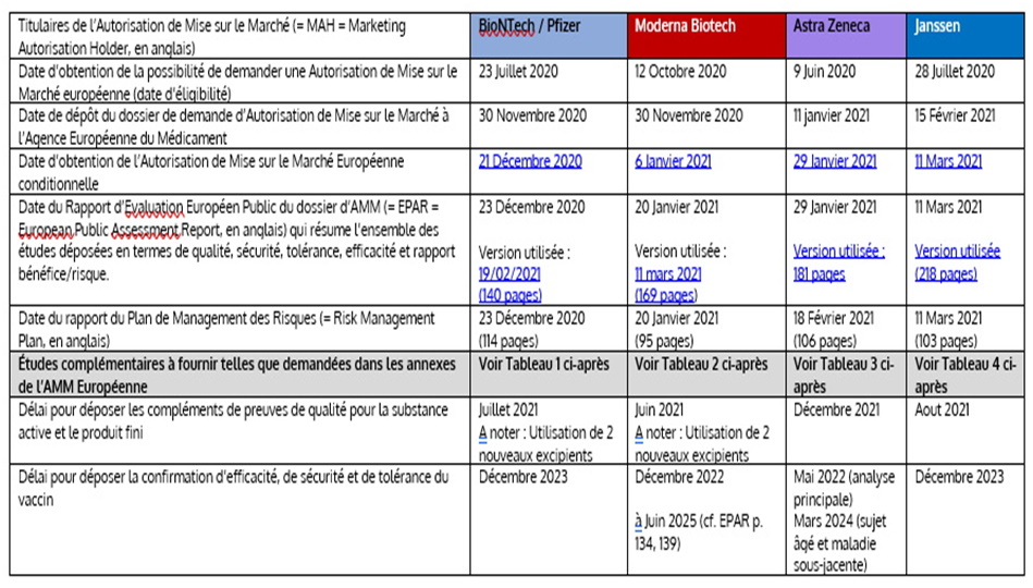 - Les demandes de mises sur le marché des 4 vaccins Pfizer, Moderne, Astra Zeneca et Janssen arrivent en front commun, s’étalant sur 3 mois seulement, du 30 novembre 2020 au 15 février 2021 : il y a visiblement une collusion entre les laboratoires pharmaceutiques, qui trahit aussi une certaine bousculade.