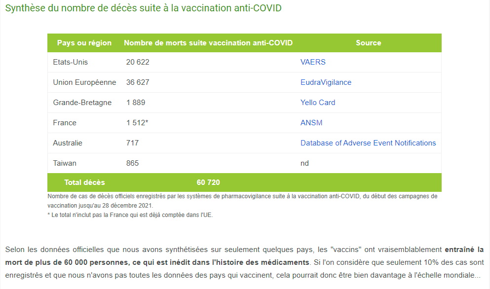 - « Aux États-Unis au 30 décembre 2021 plus de 20 600 décès y étaient reportés et plus de 32 000 personnes invalides à vie (dont des enfants aveugles ou sourds) suite à la « vaccination » anti-COVID. Là aussi c’est du jamais vu dans l’histoire des effets indésirables des médicaments et vaccins aux États-Unis ! » (notre-planete.info)