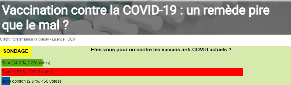 - Un sondage visible ICI, auquel vous pouvez participer. Il est peut-être sans grande valeur mais rassurant sur la santé mentale de nos concitoyens :