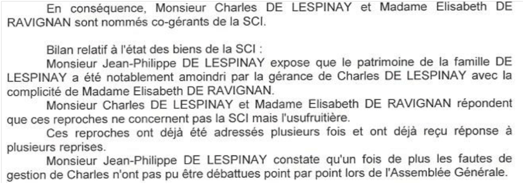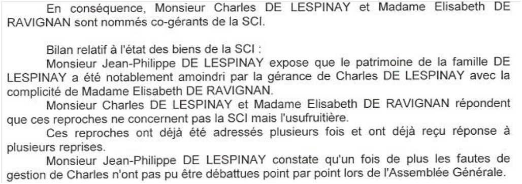 Lafouge-le-Corrompu a le front d’écrire « Monsieur Charles de Lespinay et Madame de Ravignan répondent que ces reproches ne concernent pas la SCI mais l’usufruitière ». Or l’usufruitière, c’est ma mère, placée sous la tutelle de mon frère qui décide tout à sa place, laquelle ne peut commettre de fautes de gestion puisque le gérant de la SCI c’est lui…