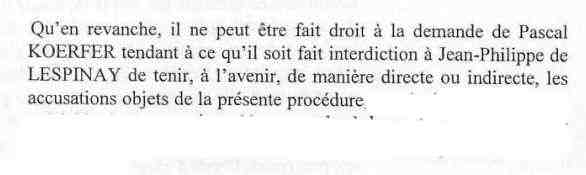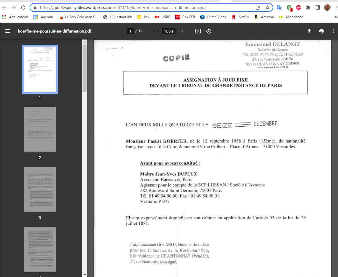 Voyez l’adresse en haut : https://jeanphilippedelespinay.blog/wp-content/uploads/2014/12/koerfer-me-poursuit-en-diffamation.pdf. Comme si c’était moi qui l’avais rédigée. Cette page cite le jugement du tribunal de Paris, trop long pour qu’on le lise, et pour un lecteur superficiel il n’en restera que ma condamnation (à 1 € symbolique) et pas l’essentiel :