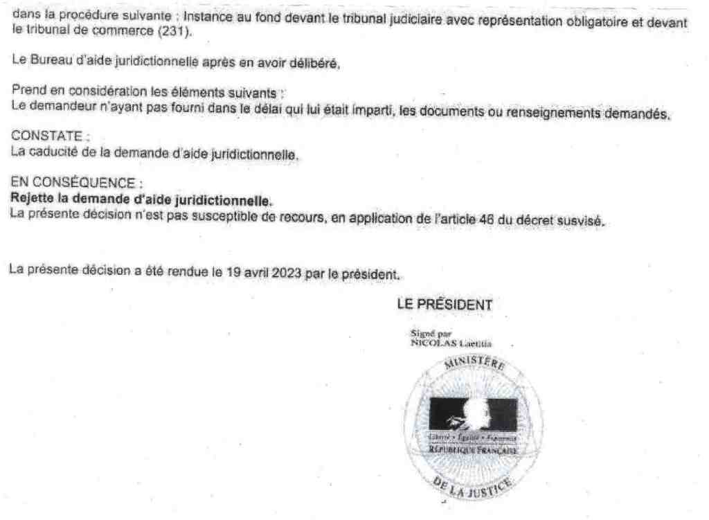 Le second courrier date du 19 avril 2024 et émane du bureau d’aide juridictionnelle de la Roche sur Yon, qui me connait. Il ne vient donc plus du tribunal de Poitiers. Extrait de la décision : rejet absolu ! Donc mon aide de 25 % est passée à 0 % en quelques semaines sous le prétexte fallacieux que je n’ai pas fourni les pièces dans le délai demandé alors qu’elles sont entre les mains du tribunal depuis mars puisqu’elles m’ont valu un accord pour 25 %.