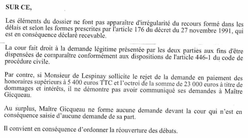 Autre fait bizarre : Gicqueau, un professionnel du barreau doté d’un secrétariat, aurait oublié de communiquer sa demande au tribunal ! Laquelle était évidente puisqu’il avait chiffré les honoraires que selon lui je lui devrais et que je contestais.