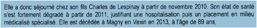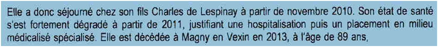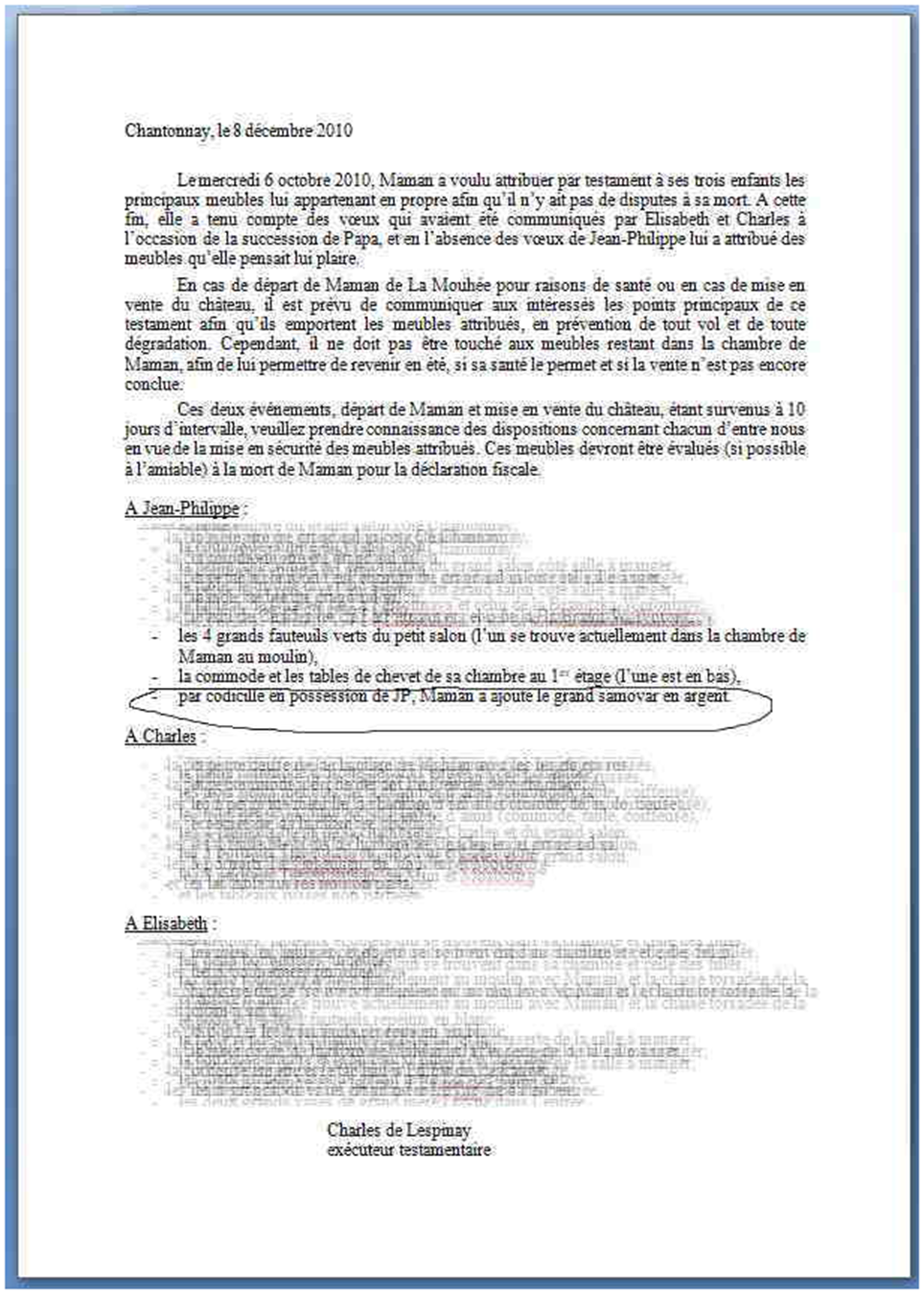 En 2011, une fois nommé tuteur et en tête à tête avec ma mère, Charles a les coudées franches. Avec sa soeur Elisabeth, une ordure qui est en fait l’âme du complot et organisait son décès accéléré alors qu’elle était la préférée, la petite dernière née 19 ans après ses frères, « sa seule fille », ils la forcent à écrire de sa main un nouveau testament falsifié.