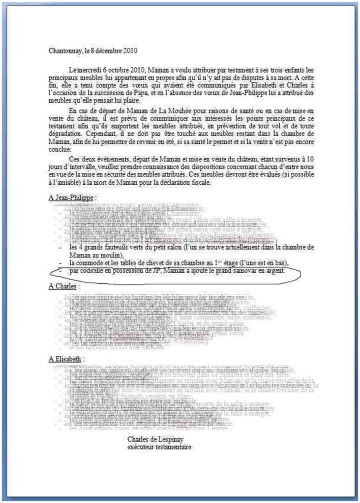 En effet, dans la première version, celle de décembre 2010, c’est mon frère qui rédige sur son ordinateur, ce n’est pas un testament « olographe » écrit par ma mère de sa main comme l’exige la loi. Il vient d’enlever notre mère et de l’installer chez lui à 86 ans, elle est donc totalement sous sa coupe. Il a retiré bien entendu du texte les biens qu’il lui a volés avec sa soeur entre 2010 et 2012 mais que des commissaires-prieurs retrouveront chez eux en 2017. Elle a encore un peu d’énergie en dépit de sa vulnérabilité reconnue par la médecine (en juin 2010) et impose à mon frère d’écrire ce dont elle se souvient et qu’elle tient particulièrement à me lèguer, dont le samovar en argent de famille qu’elle avait pourtant destiné à mon frère :