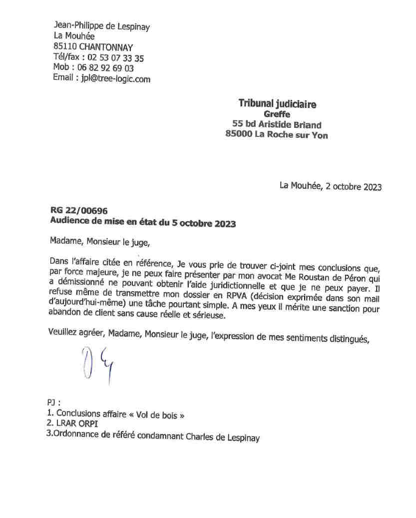 Quant à l’avocat Roustan de Peron, j’ai bien expliqué au tribunal dans la lettre en recommandé ci-dessous, tout en remettant mes conclusions, qu’il avait refusé de me représenter faute d’aide juridictionnelle :
