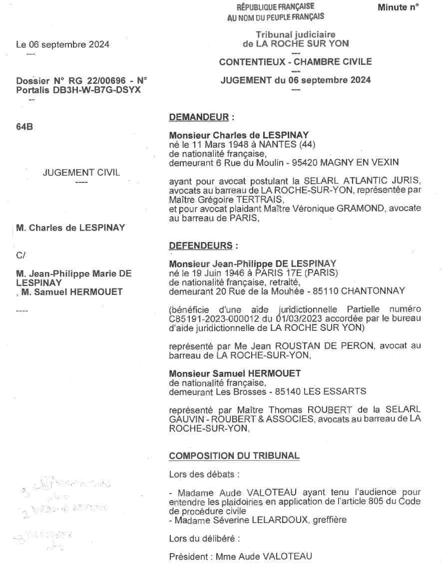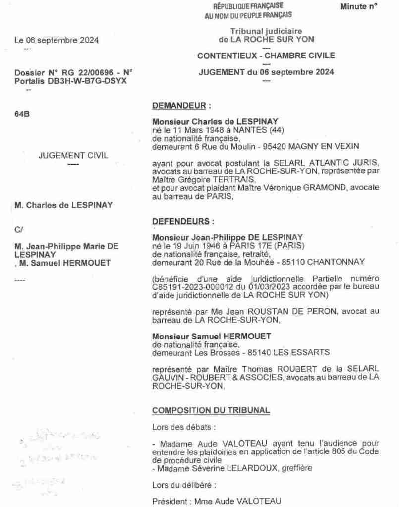 - Le juge ne peut s’empêcher de nommer « le parc » la forêt d’agrément du château de la Mouhée. Appellation, historique, justifiée. Il ne dit pas « les arbres des parcelles agricoles ». Or, il n’est jamais fait mention de parc dans l’héritage de mon frère dont il se prévaut, invoqué par le juge. Dans l’état liquidatif du notaire de la succession Emmanuel Lafouge, notaire personnel de Charles de Lespinay je le rappelle, donc en plein conflit d’intérêt et à condamner, qui a décidé des partages sans me consulter ni m’informer et les a transmis aux tribunaux, il est fait mention de parcelles « à usage agricole » pour rendre le parc invisible. Commettant ainsi la même erreur que moi, le juge peut difficilement arguer qu’il est évident que je savais que les arbres coupés ne m’appartenaient pas.