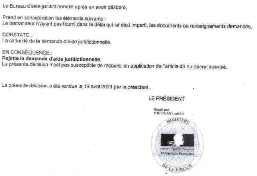 Voyez d’entrée de jeu les affirmations mensongères de la juge Aude Valoteau : « Bénéficie d’une aide juridictionnelle partielle » et « représenté par Me Jean Roustan de Peron ». Elle prépare le terrain pour pouvoir justifier plus tard qu’elle n’a pas reçu mes conclusions alors que je disposais d’une aide financière et d’un avocat. Elle ne dit pas que l’aide juridictionnelle partielle (25 %), déjà insignifiante, a été ramenée à 0 % « sans possibilité de recours » par la « présidente » du tribunal de La Roche sur Yon Laetitia Nicolas le 19 avril 2023 sous le faux prétexte du manque de pièces sans indiquer lesquelles.