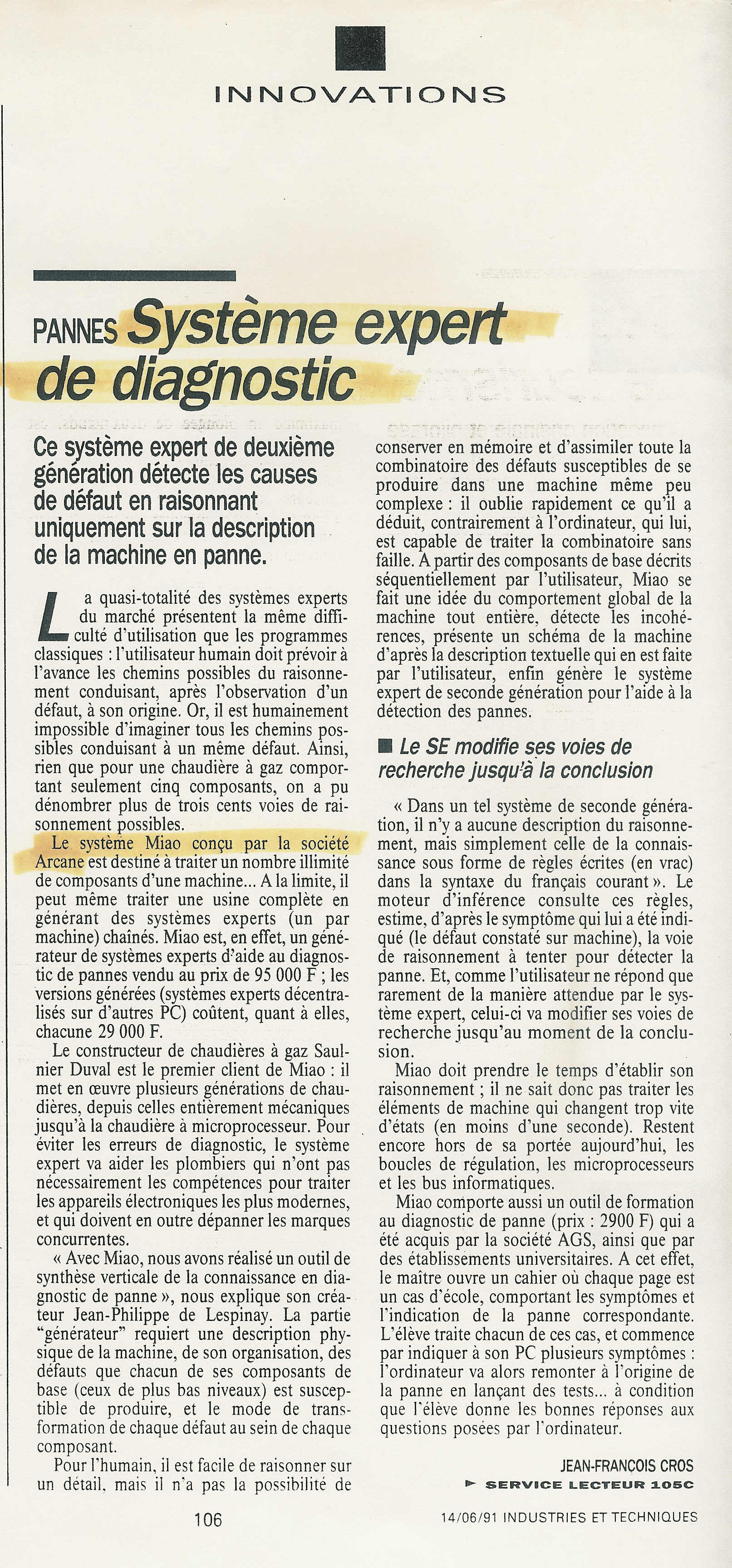 18. Systèmes Experts, December 10, 1992: « MOCA, moteur d’inférence ou plutôt mécanisme de raisonnement (…) dont le fonctionnement est identique quel que soit le domaine…(…) les raisonnements utilisés peuvent être expliqués par le système à tout moment (…) Les systèmes experts d’Arcane fonctionnent tous sur ce principe et sont les seuls quasiment maintenant sur le marché de l’informatique à appliquer la logique d’ordre zéro + ».