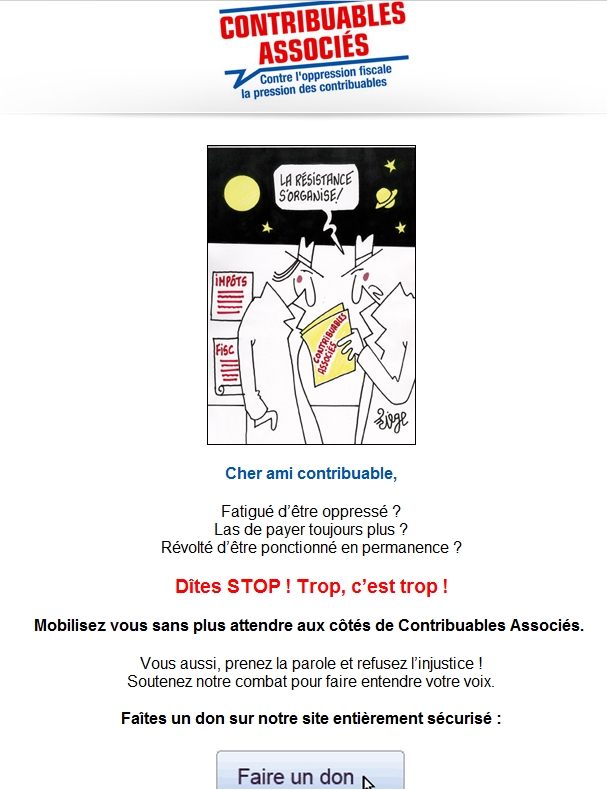 Chaque Français percevant une rémunération a le devoir d’en céder une partie à l’État sous forme d’impôt. De même, toute entreprise présente sur le territoire français doit céder une partie de ses revenus sous forme d’impôts. L’État utilise cet argent pour financer son fonctionnement, pour améliorer les conditions du bien-être du peuple français et pour le rayonnement de la France hors de ses frontières. Tout autre usage est illégal et devra être réprimé. Le calcul de cet impôt est défini par le Président de la République et peut varier dans le temps. Il est dicté par les deux principes suivants : trop d’impôt tue l’impôt, un bon impôt est un impôt réduit au maximum.