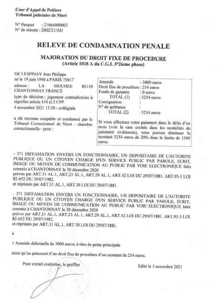 Ajoutons à cela les huit mois de réflexion du tribunal correctionnel de Niort au cours desquels ce tribunal a du consulter toute la hiérarchie jusqu’à la cassation, pour aboutir finalement à ma bizarre condamnation.