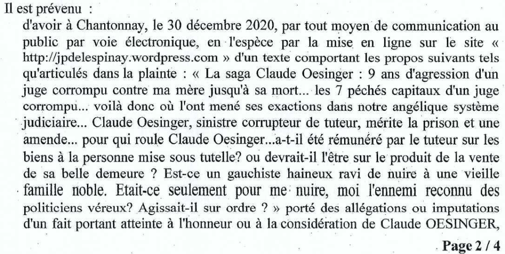 Par ailleurs, je suis lanceur d’alerte et un lanceur d’alerte est protégé par la loi pour ses signalements de corruption. C’est clairement mon cas puisque j’accuse Oesinger d’avoir donné ma mère en tutelle à un ennemi, mon frère, sans me consulter ni m’en aviser, ce que deux tribunaux ont d’ailleurs déjà blâmé. Je l’accuse d’avoir fait pire encore : il l’a gardée sous la tutelle de cet ennemi pour qu’il puisse s’emparer du patrimoine familial – il devient gérant de notre SCI et de la totalité de nos biens – jusqu’à ce qu’en deux ans elle meure de sa séquestration à 470 km de chez elle et des abus de faiblesse du tuteur !