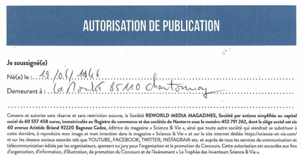 Le 5 mai 2021, Science et Vie me fait signer une autorisation de publication qui reconnait officiellement l’existence de mon invention :