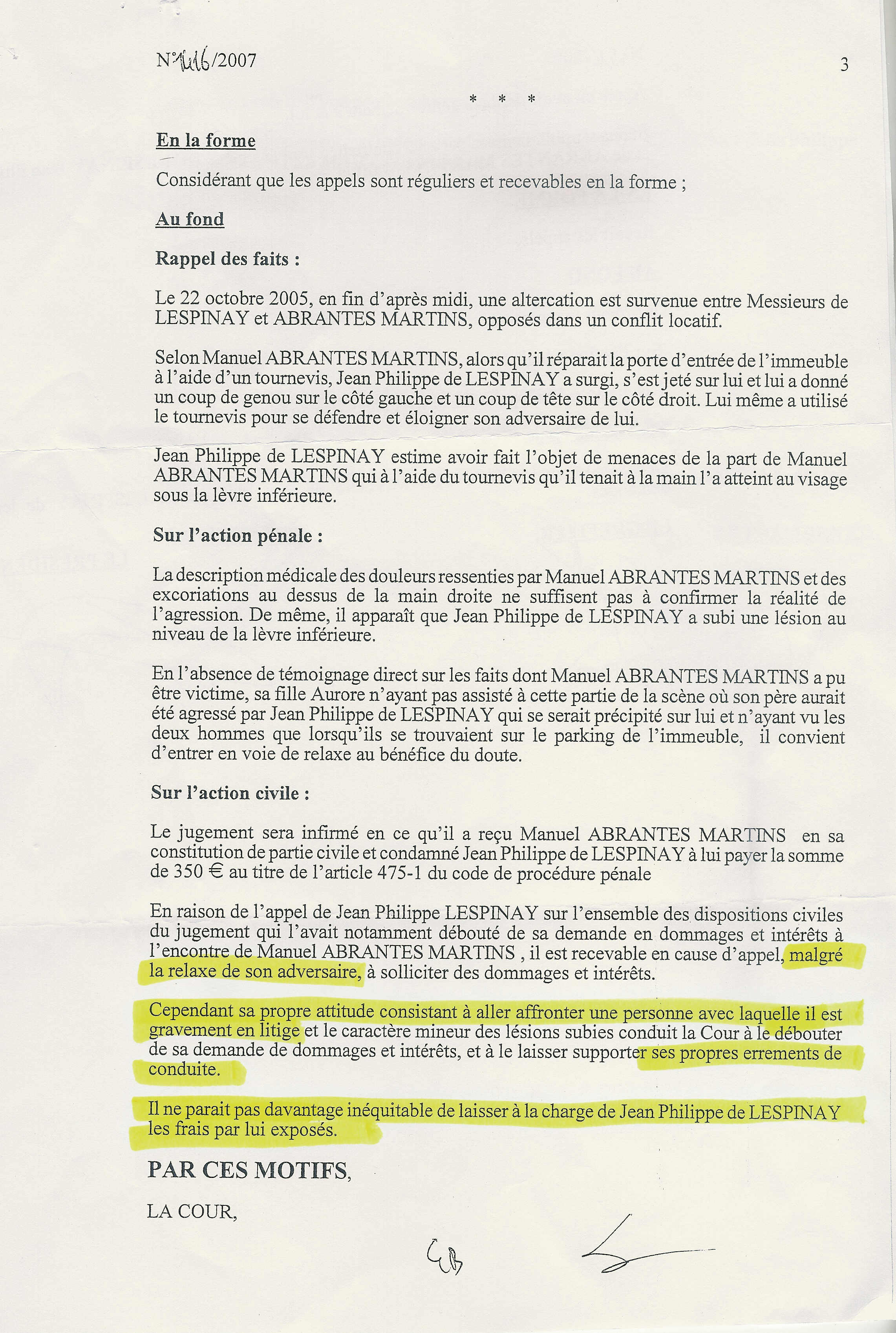 La corruption est donc bien présente jusqu’au sommet de la justice ! Oh… bien entendu, certains me diront, comme Me de Salve mon avocat, que la nouvelle législation donne le droit à la Cour d’agir ainsi, pour éviter sa saturation devant les « petits » cas… Mais mon cas ne peut pas être considéré comme petit, du moins comparé aux précédents que la Cour avait accepté de juger ! Le montant des dommages et intérêts demandés : 10 000 € et leur justification réelle : préjudices subis attestés par 4 expertises, témoignage écrit du locataire précédent, plainte pour coups et blessures validée par la cour d’appel de Rennes, tout ça représente un moyen sérieux de cassation. Ma condamnation à payer un mois de loyer en trop est vraiment une erreur à rectifier (que j’arriverai d’ailleurs ensuite à faire réparer en allant une nouvelle foi en justice auprès de la cour d’appel de Rennes !). La sanction incroyable que j’ai subie : l’expulsion, mérite bien que la justice s’attache un peu à mon cas. Ma plainte pour forfaiture contre le juge de l’exécution qui avait fabriqué 4 faux pour me faire expulser fissa, plainte extrêmement grave s’inscrivant dans cette affaire et que les juges de cassation ne peuvent ignorer, montre bien que M. de Lespinay a simplement besoin de justice. Or, on vient, une fois de plus, de la lui refuser… Une fois de plus, Martins a échappé à une sanction pécuniaire méritée. ça ne peut plus être du hasard…