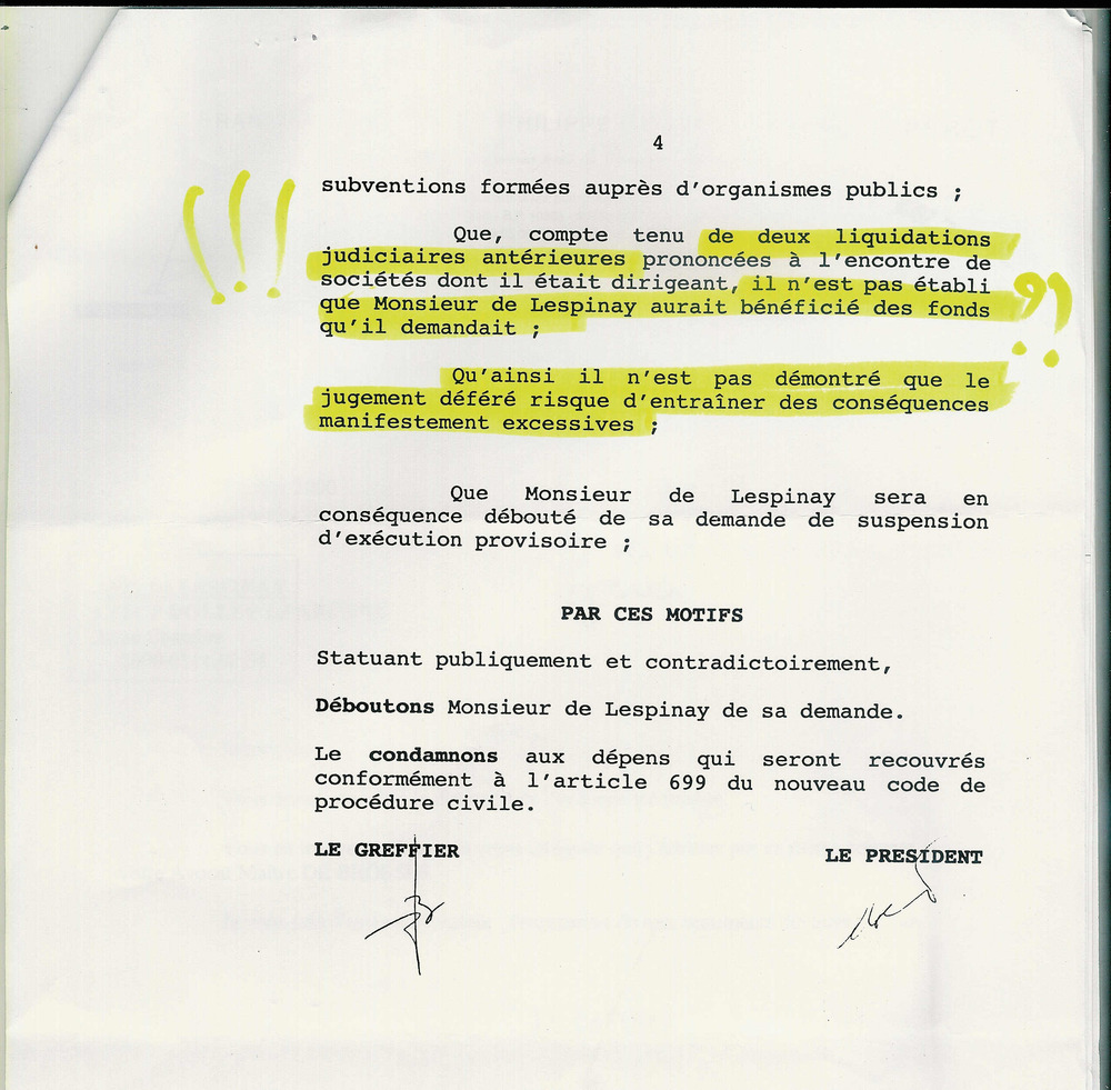 La science universitaire venait d’être ridiculisée par un amateur ! Là, ça ne suffisait plus d’attaquer le Lespinay et de jeter son invention aux oubliettes, on allait passer à l’arme suprême au service du fonctionnaire corrompu : recruter du magistrat pour couler son entreprise et le ruiner. C’est fait…