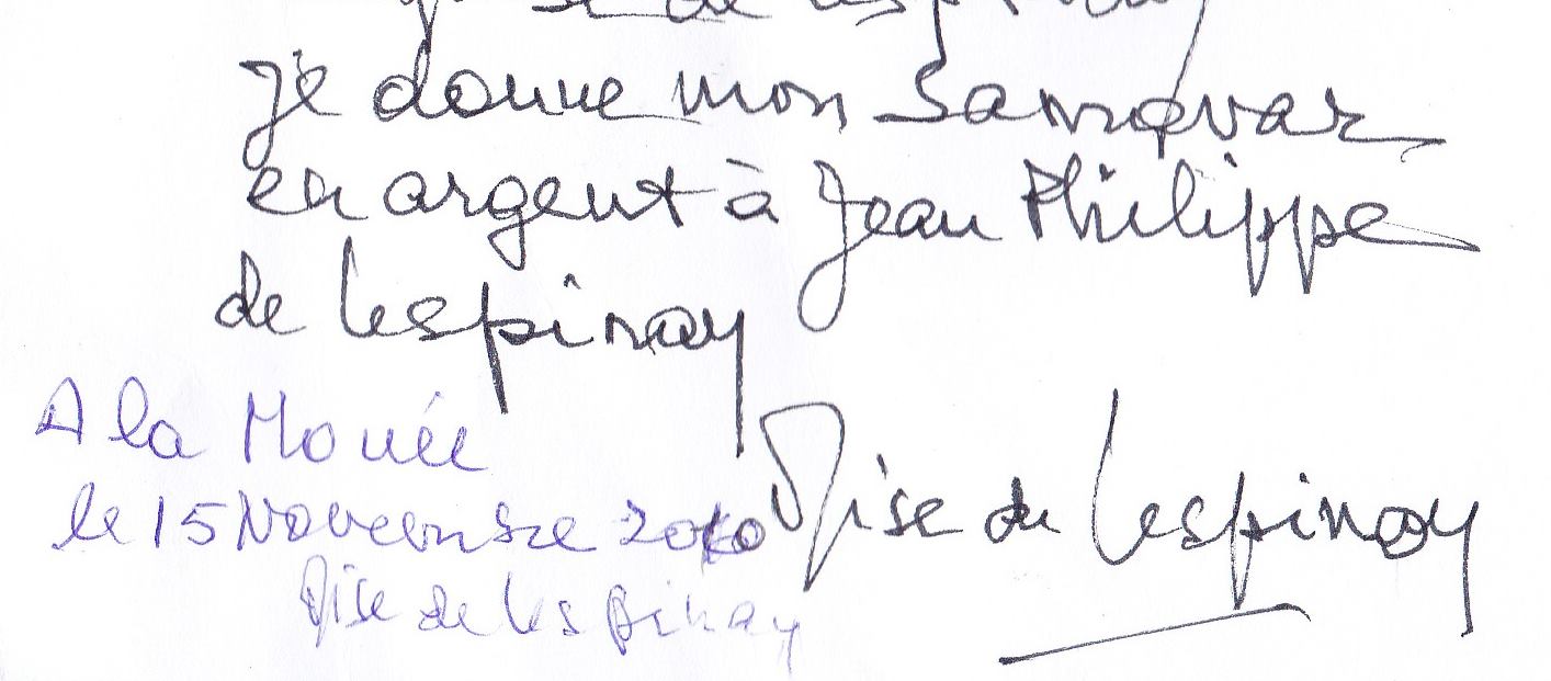 Attestation signée par ma mère le 15 novembre 2010, dix jours avant son départ en exil chez mon frère, qui me donne son samovar (notez l’écriture décidée qui montre qu’elle n’est pas contrainte, contrairement au testament que mon frère et ma sœur lui dicteront après son départ)
