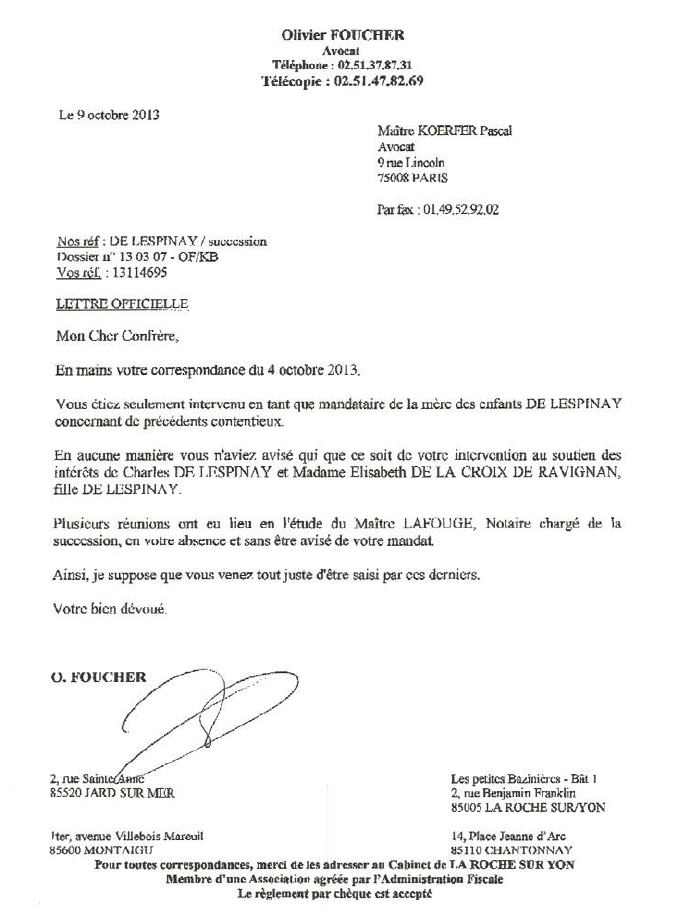 Non seulement ma mère est hors du coup mais le juge chargé de statuer sur mon expulsion désigne lui-même mon frère comme coupable :« Il résulte de l’ensemble des pièces versées que le fait s’inscrit dans le cadre d‘une rivalité et d’un conflit entre frères, ne permettant pas de caractériser l’existence d’un trouble manifestement illicite imputable au seul Jean-Philippe DE LESPINAY (…) La procédure de référé pour solliciter l’expulsion d’un frère par un frère, en urgence, sans qu’aucun véritable débat au fond n’ait pu s’instaurer, est inadaptée » (ordonnance du 27 septembre 2012). En bonne logique (mon domaine…) puisque ce n’est pas moi qui cherche constamment à nuire à ma famille, c’est bien mon frère Charles l’agresseur. Ce que le juge a vu si facilement, il est impossible que Koerfer ne l’ait pas vu. Et s’il prétend ne pas l’avoir vu, il n’osera jamais prétendre que le juge ne l’a pas informé et que rien ne l’obligeait à prendre ses distances avec ses commanditaires occultes…
