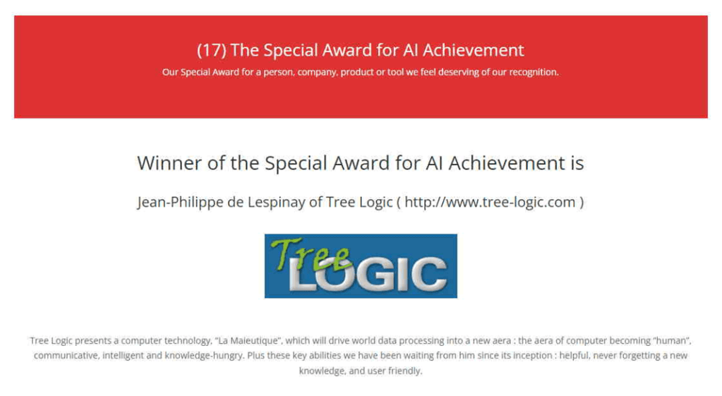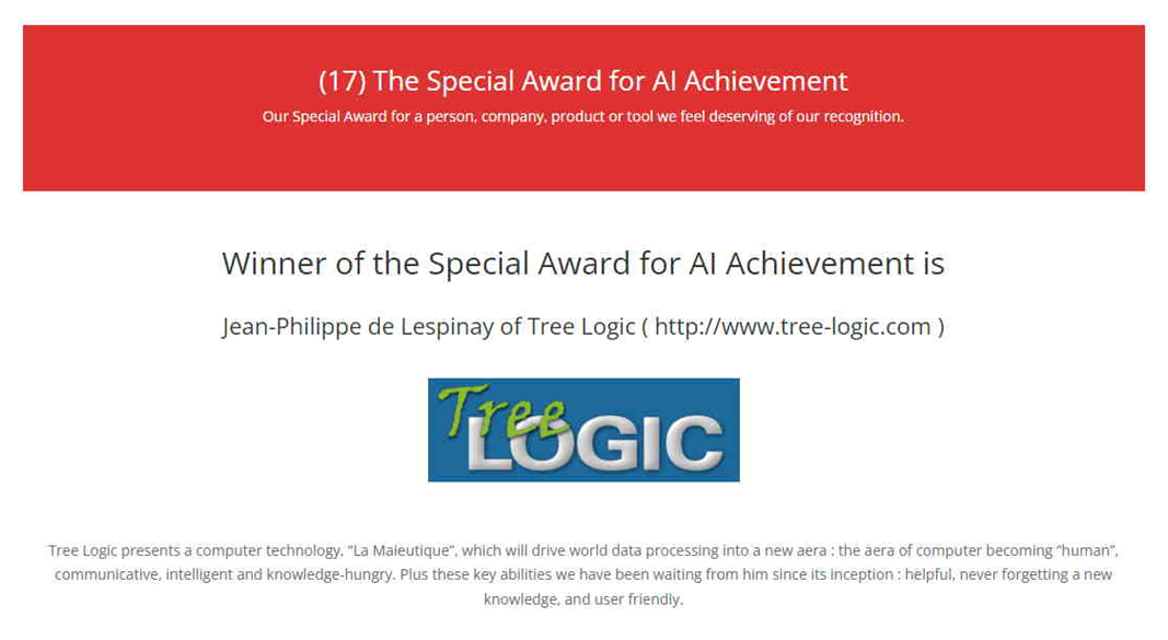 Une autre fois, ce fut avec un autre prix américain Awards.Ai qui cette fois-ci m’avait primé en 2017. Son jury avait créé une catégorie spéciale pour pouvoir récompenser l’intelligence artificielle raisonnante : la catégorie « AI achievement ». C’est-à-dire : intelligence artificielle opérationnelle. Toutes les autres catégories étaient destinées aux informaticiens, considérées comme non opérationnelles en tant qu’IA c’est-à-dire relevant en fait de l’informatique classique. Quand le prix accordé à mon invention fut connu, il était accompagné de ce commentaire (Tree Logic étant ma société) :