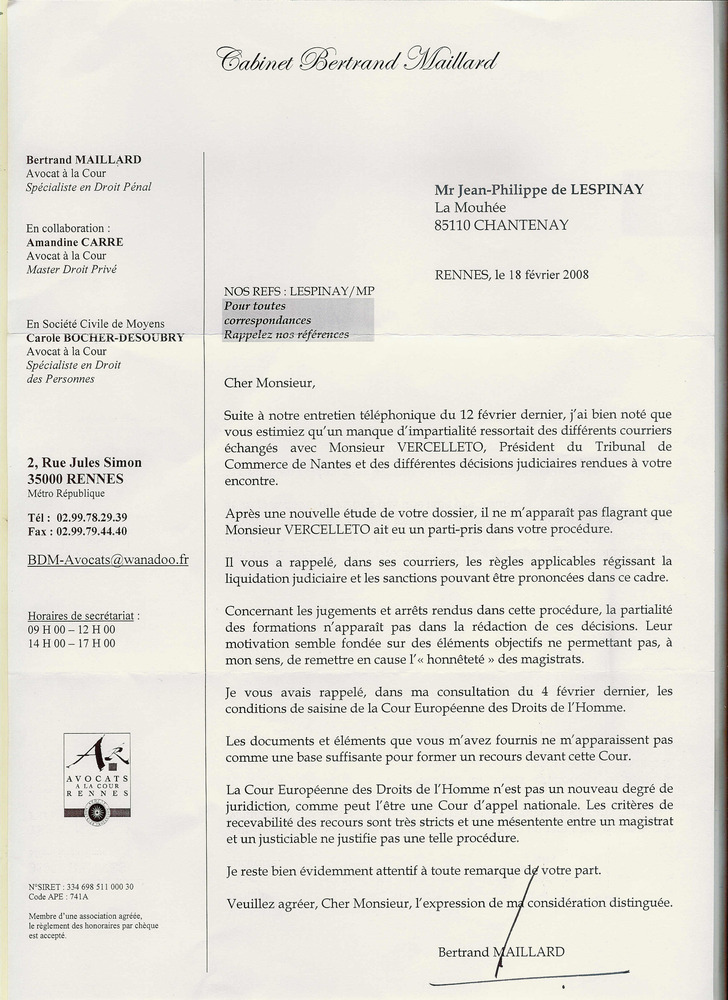 Devant tant d’impudeur, mon avocat lui répond vertement qu’il a menti. Pas de réponse. Un aveu de plus ! Voyez sa lettre, tout aussi « officielle » :