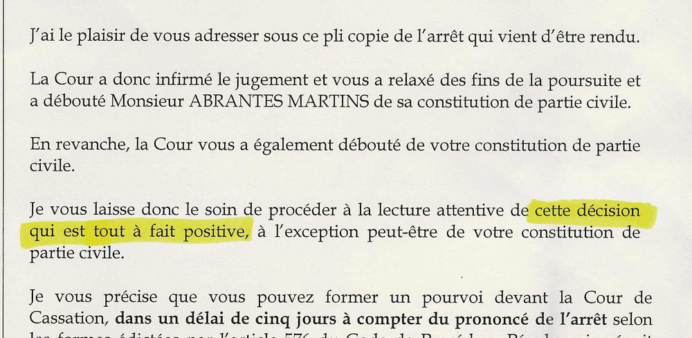 A la lecture de ce courrier et de son argumentation en quatre points, le bâtonnier refusera de m’accorder la démission de Koerfer mais ne s’indignera pas de mes propos ni ne me dira qu’ils sont diffamatoires. Il juge donc mes accusations recevables, ce que va confirmer la justice « régulière » suite à la plainte en diffamation de Koerfer.