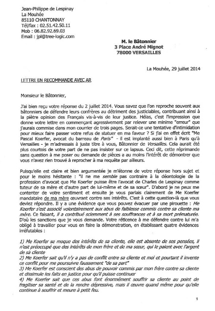 Officiellement, Pascal Koerfer a reçu pour mission de mon frère, tuteur, de défendre les intérêts de notre mère contre mes agissements (prétendument) contraires à ses intérêts. Je vais démontrer ci-après de façon irréfutable, en quatre points, qu’il a fait exactement le contraire. Voilà d’ailleurs la 1ère page de mon courrier du 29 juillet 2014 qui détaille ces points adressé au bâtonnier Frédéric Landon pour lui réclamer la démission de Koerfer comme avocat de mon frère et ma sœur (pour en lire la totalité du courrier voir cet article) :